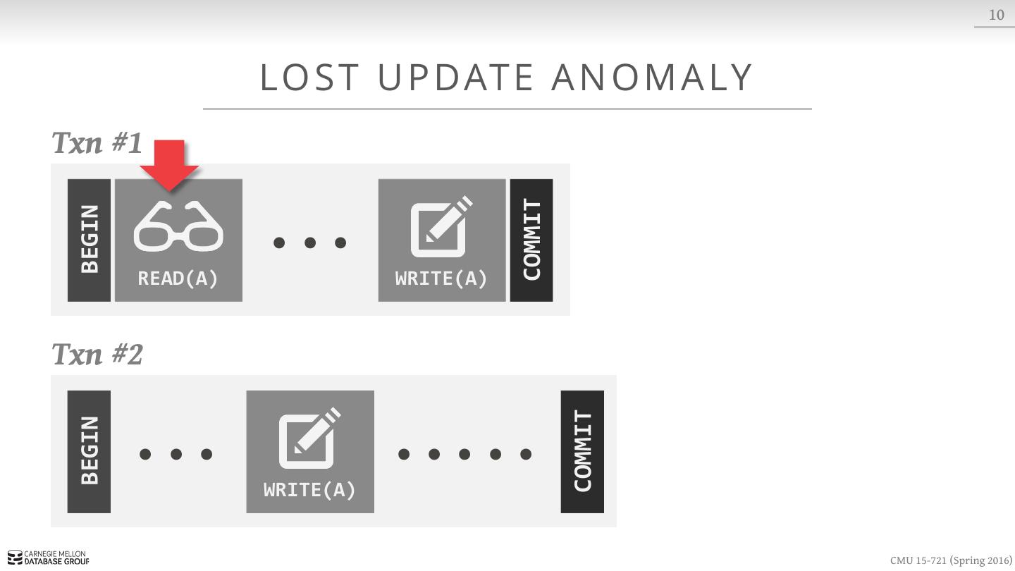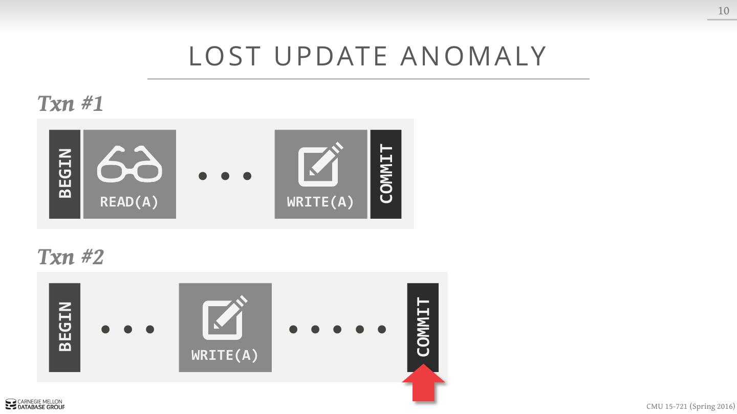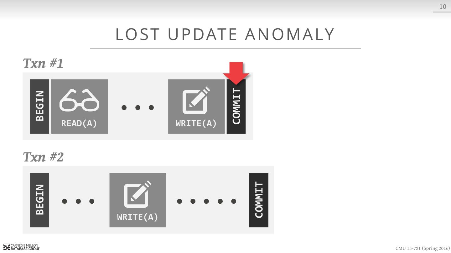 11 . 10 LO S T U P DAT E A N O M A LY Txn #1 COMMIT BEGIN • • • READ(A) WRITE(A) Txn #2 COMMIT BEGIN • • • • • • • • WRITE(A) CMU 15-721 (Spring 2016)