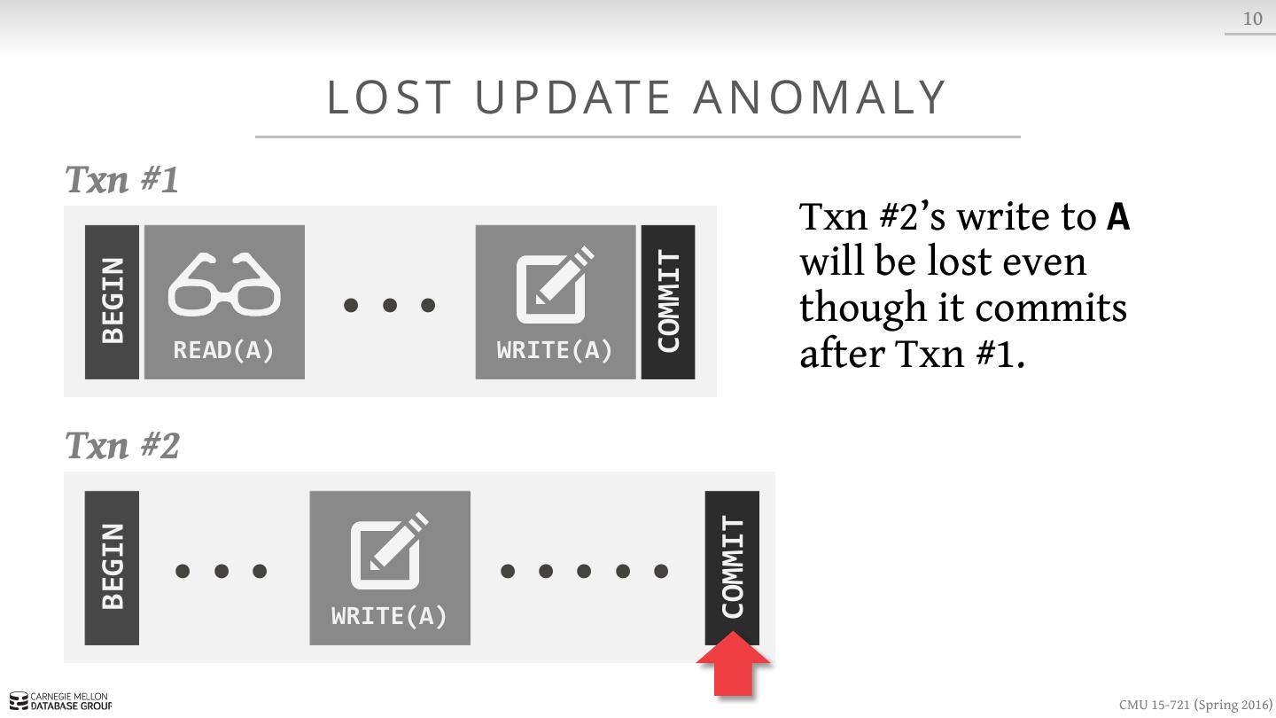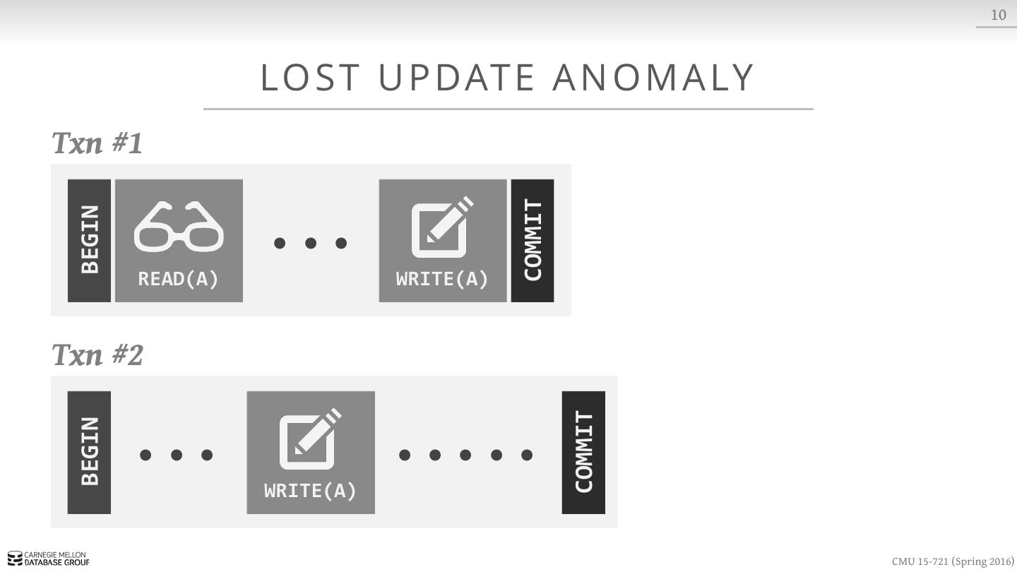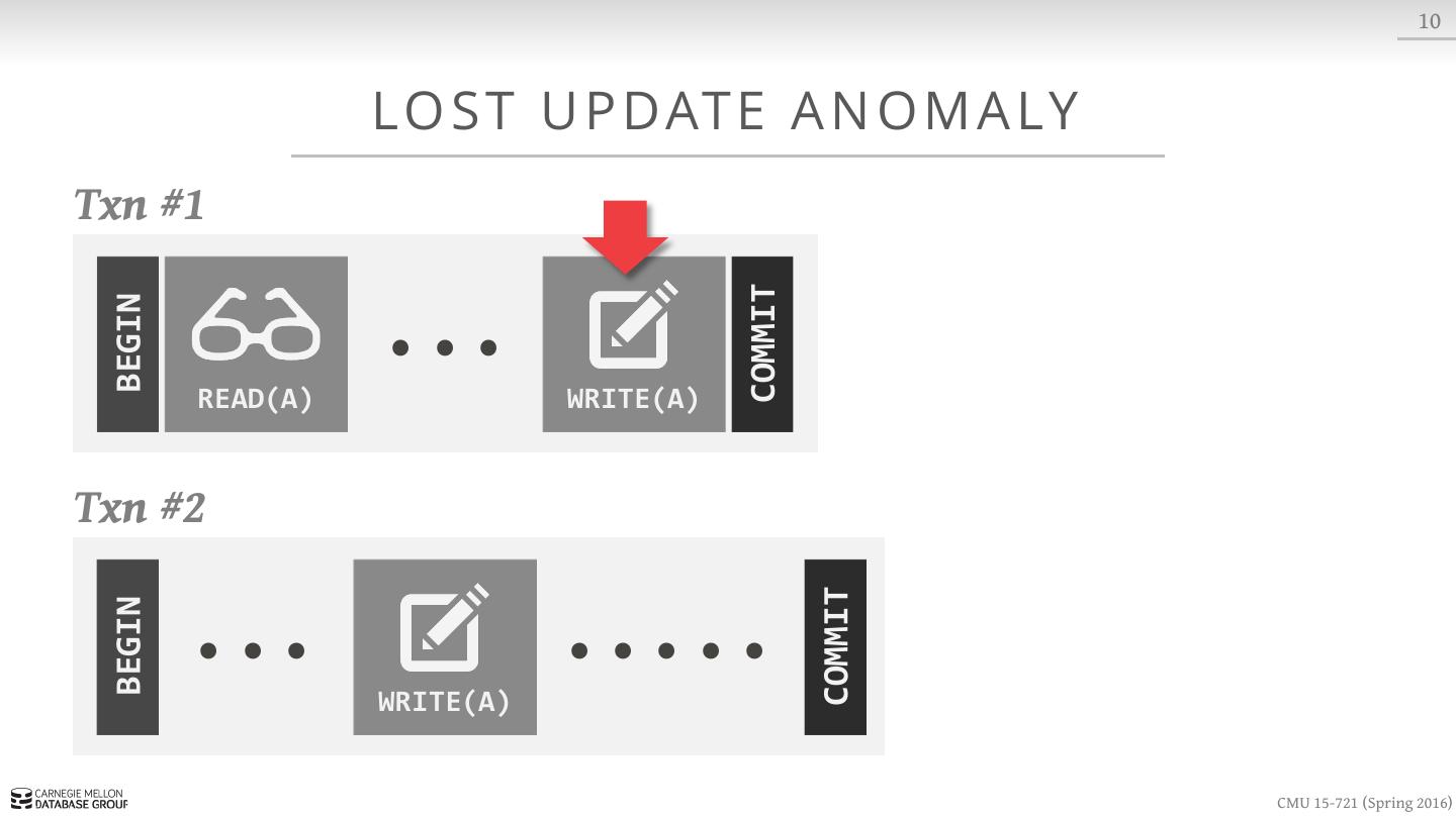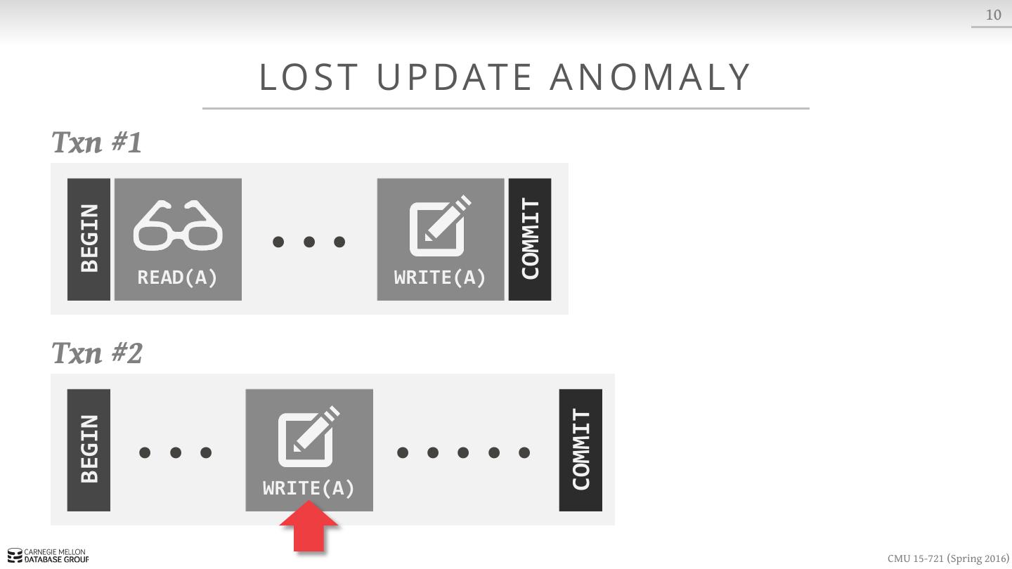 11 . 10 LO S T U P DAT E A N O M A LY Txn #1 COMMIT BEGIN • • • READ(A) WRITE(A) Txn #2 COMMIT BEGIN • • • • • • • • WRITE(A) CMU 15-721 (Spring 2016)