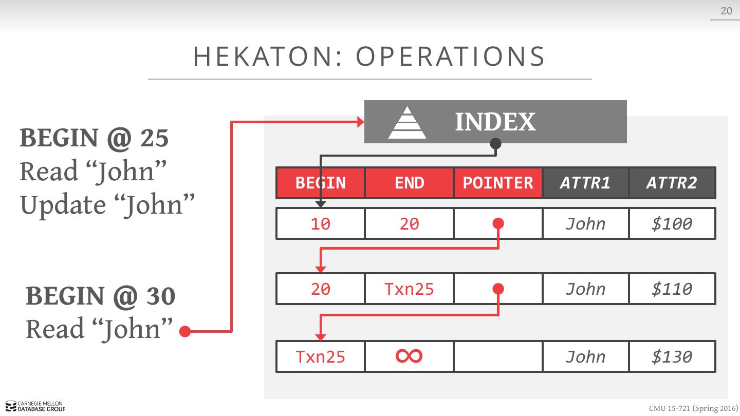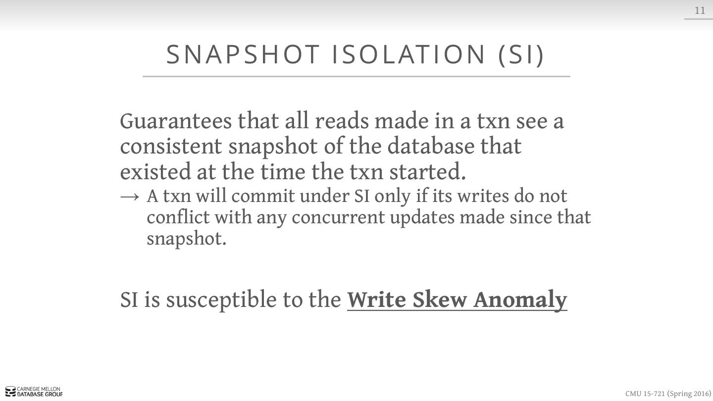 19 . 11 S N A P S H OT I S O L AT I O N ( S I ) Guarantees that all reads made in a txn see a consistent snapshot of the database that existed at the time the txn started. → A txn will commit under SI only if its writes do not conflict with any concurrent updates made since that snapshot. SI is susceptible to the Write Skew Anomaly CMU 15-721 (Spring 2016)