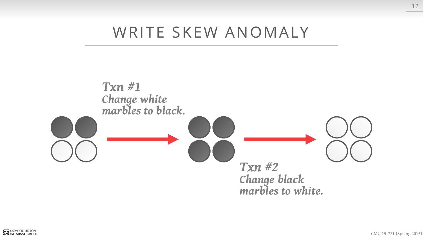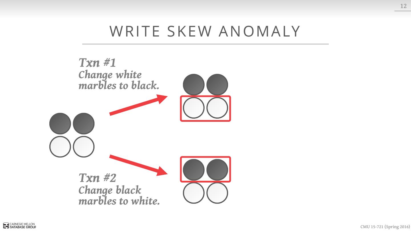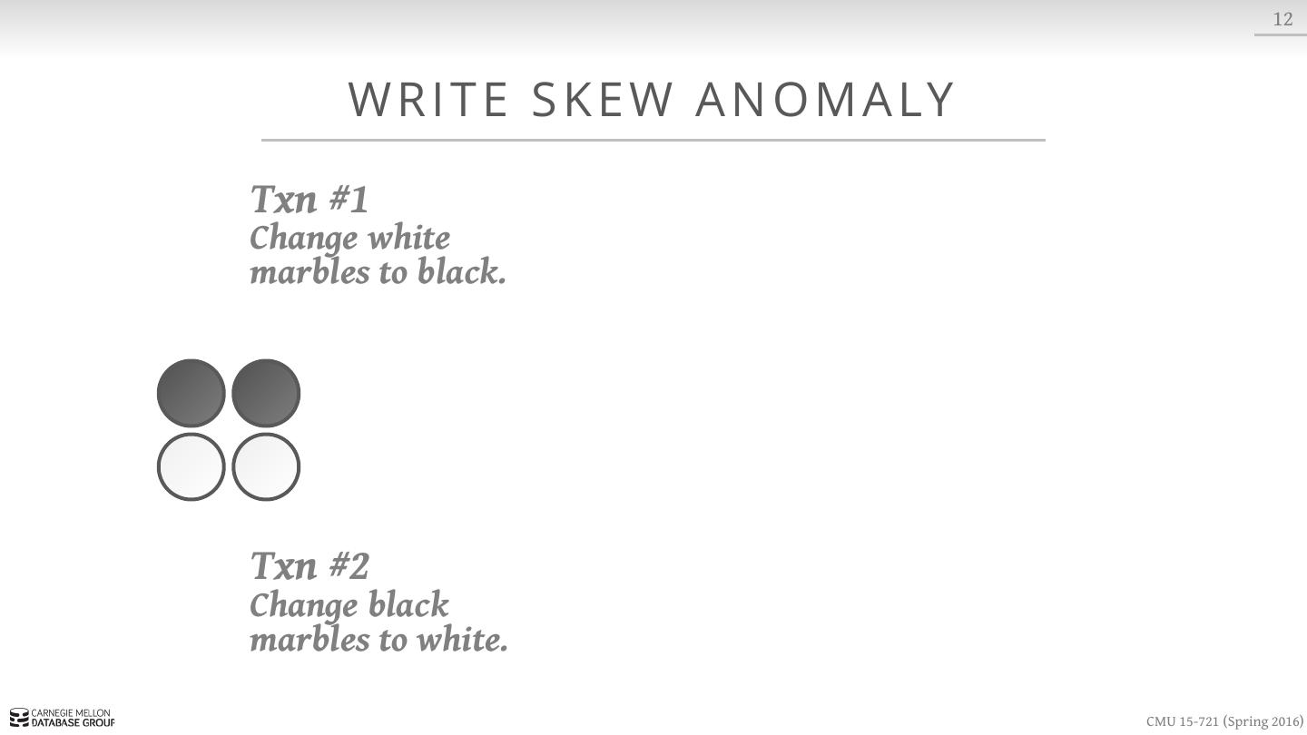 25 . 12 W R I T E S K E W A N O M A LY Txn #1 Change white marbles to black. Txn #2 Change black marbles to white. CMU 15-721 (Spring 2016)