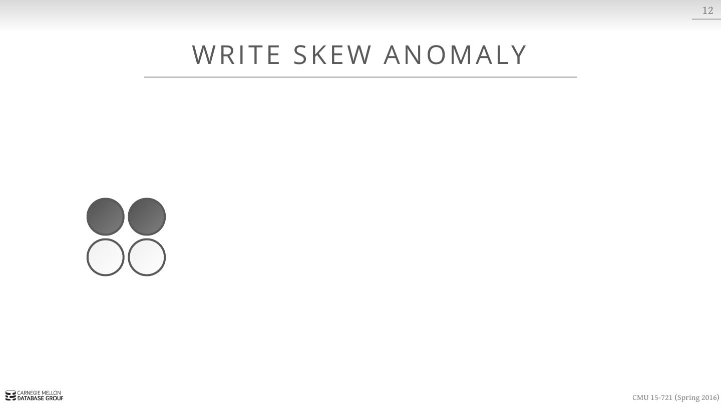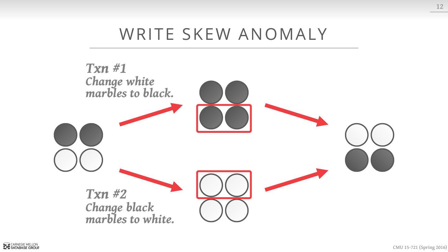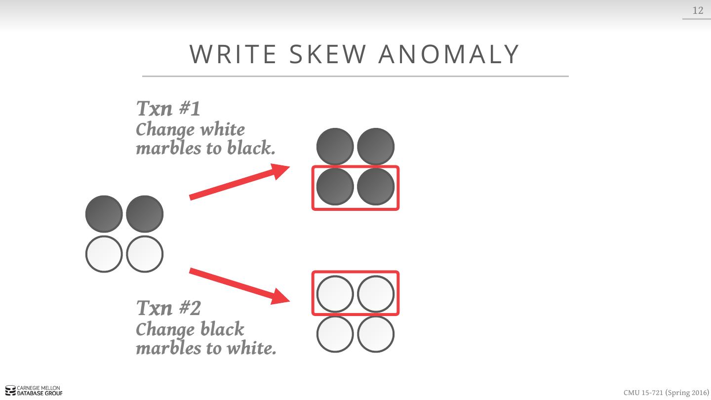 25 . 12 W R I T E S K E W A N O M A LY Txn #1 Change white marbles to black. Txn #2 Change black marbles to white. CMU 15-721 (Spring 2016)
