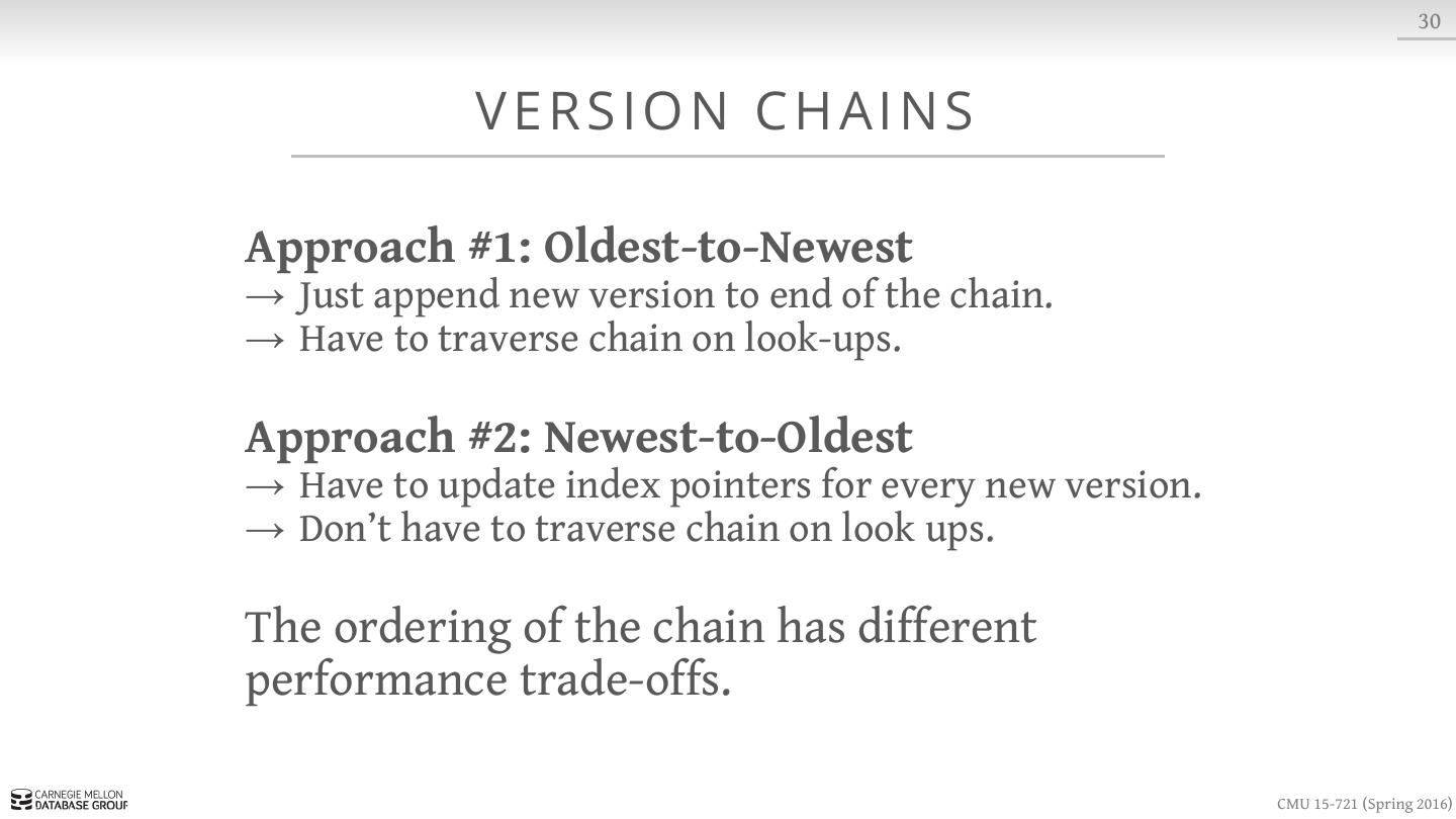 29 . 13 I S O L AT I O N L E V E L H I E R A R C H Y SERIALIZABLE REPEATABLE READS SNAPSHOT ISOLATION CURSOR STABILITY READ COMMITTED READ UNCOMMITTED CMU 15-721 (Spring 2016)