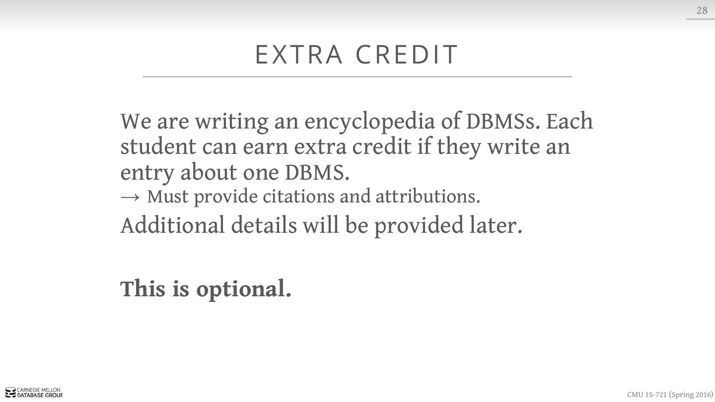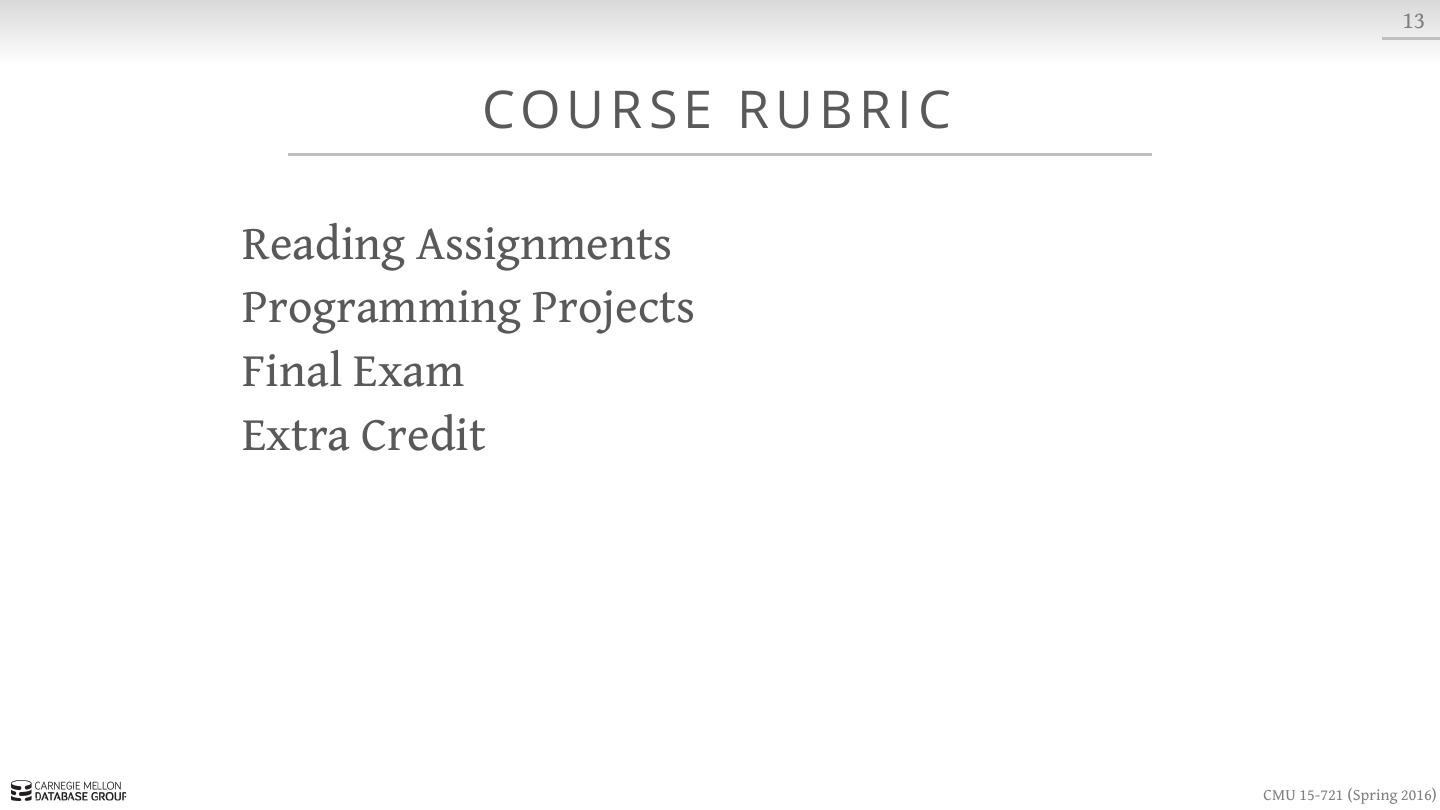 17 . 13 CO U R S E R U B R I C Reading Assignments Programming Projects Final Exam Extra Credit CMU 15-721 (Spring 2016)