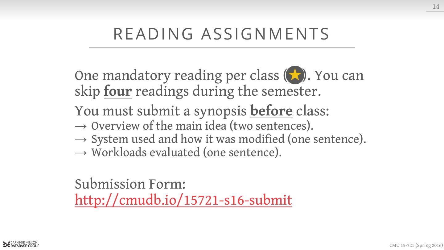 18 . 14 READING ASSIGNMENTS One mandatory reading per class (★). You can skip four readings during the semester. You must submit a synopsis before class: → Overview of the main idea (two sentences). → System used and how it was modified (one sentence). → Workloads evaluated (one sentence). Submission Form: http://cmudb.io/15721-s16-submit CMU 15-721 (Spring 2016)