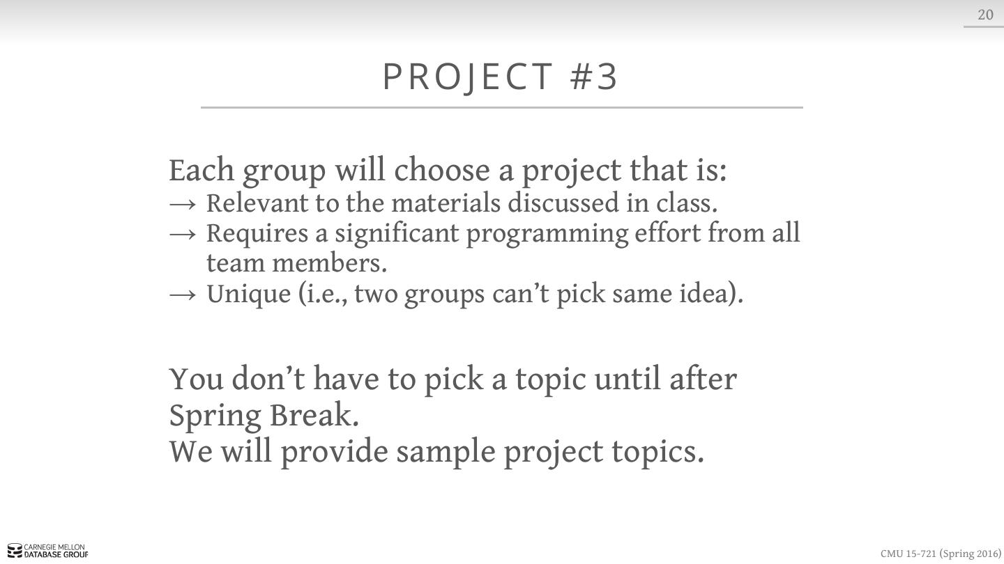 24 . 20 PROJECT #3 Each group will choose a project that is: → Relevant to the materials discussed in class. → Requires a significant programming effort from all team members. → Unique (i.e., two groups can’t pick same idea). You don’t have to pick a topic until after Spring Break. We will provide sample project topics. CMU 15-721 (Spring 2016)