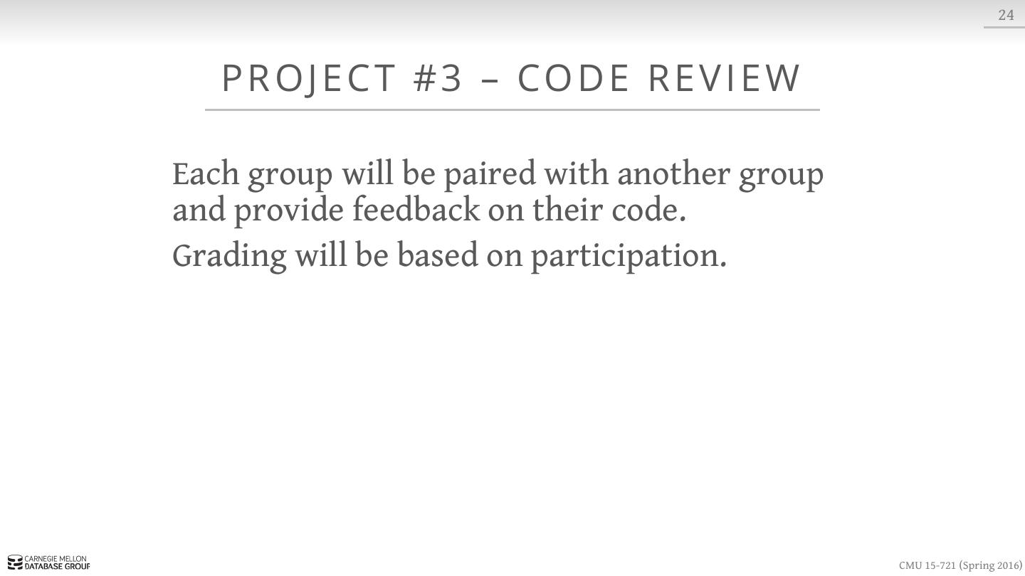 28 . 24 P R O J E C T # 3 – CO D E R E V I E W Each group will be paired with another group and provide feedback on their code. Grading will be based on participation. CMU 15-721 (Spring 2016)