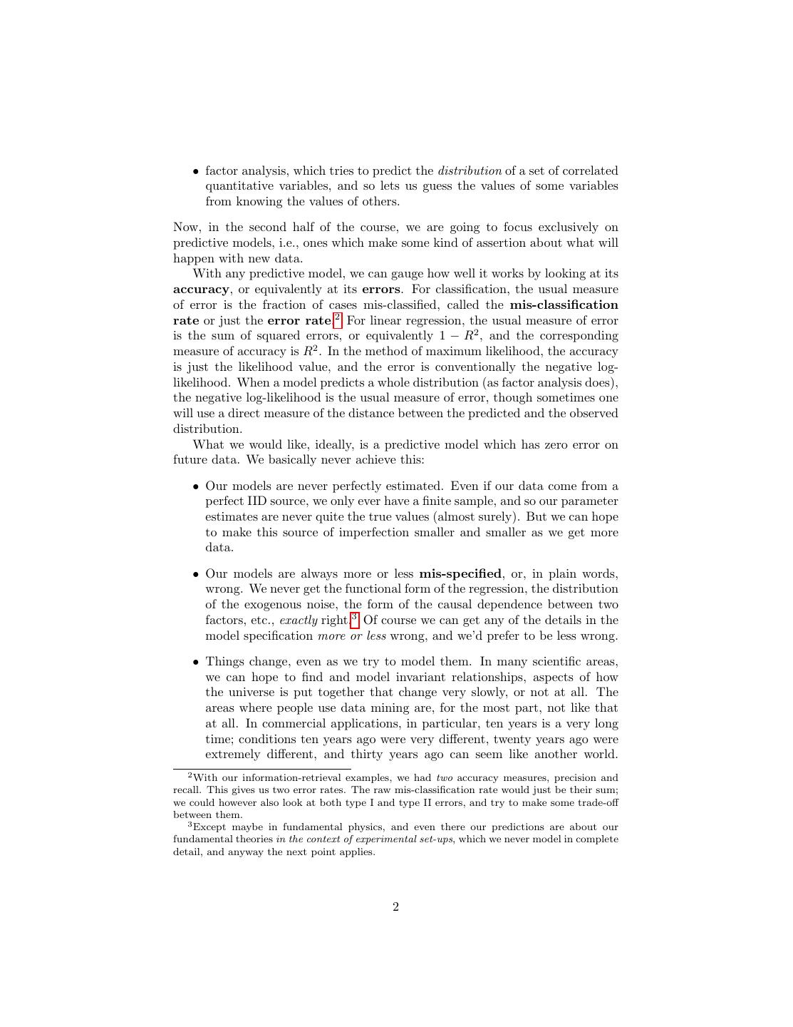 2 . • factor analysis, which tries to predict the distribution of a set of correlated quantitative variables, and so lets us guess the values of some variables from knowing the values of others. Now, in the second half of the course, we are going to focus exclusively on predictive models, i.e., ones which make some kind of assertion about what will happen with new data. With any predictive model, we can gauge how well it works by looking at its accuracy, or equivalently at its errors. For classification, the usual measure of error is the fraction of cases mis-classified, called the mis-classification rate or just the error rate.2 For linear regression, the usual measure of error is the sum of squared errors, or equivalently 1 − R2 , and the corresponding measure of accuracy is R2 . In the method of maximum likelihood, the accuracy is just the likelihood value, and the error is conventionally the negative log- likelihood. When a model predicts a whole distribution (as factor analysis does), the negative log-likelihood is the usual measure of error, though sometimes one will use a direct measure of the distance between the predicted and the observed distribution. What we would like, ideally, is a predictive model which has zero error on future data. We basically never achieve this: • Our models are never perfectly estimated. Even if our data come from a perfect IID source, we only ever have a finite sample, and so our parameter estimates are never quite the true values (almost surely). But we can hope to make this source of imperfection smaller and smaller as we get more data. • Our models are always more or less mis-specified, or, in plain words, wrong. We never get the functional form of the regression, the distribution of the exogenous noise, the form of the causal dependence between two factors, etc., exactly right.3 Of course we can get any of the details in the model specification more or less wrong, and we’d prefer to be less wrong. • Things change, even as we try to model them. In many scientific areas, we can hope to find and model invariant relationships, aspects of how the universe is put together that change very slowly, or not at all. The areas where people use data mining are, for the most part, not like that at all. In commercial applications, in particular, ten years is a very long time; conditions ten years ago were very different, twenty years ago were extremely different, and thirty years ago can seem like another world. 2 With our information-retrieval examples, we had two accuracy measures, precision and recall. This gives us two error rates. The raw mis-classification rate would just be their sum; we could however also look at both type I and type II errors, and try to make some trade-off between them. 3 Except maybe in fundamental physics, and even there our predictions are about our fundamental theories in the context of experimental set-ups, which we never model in complete detail, and anyway the next point applies. 2