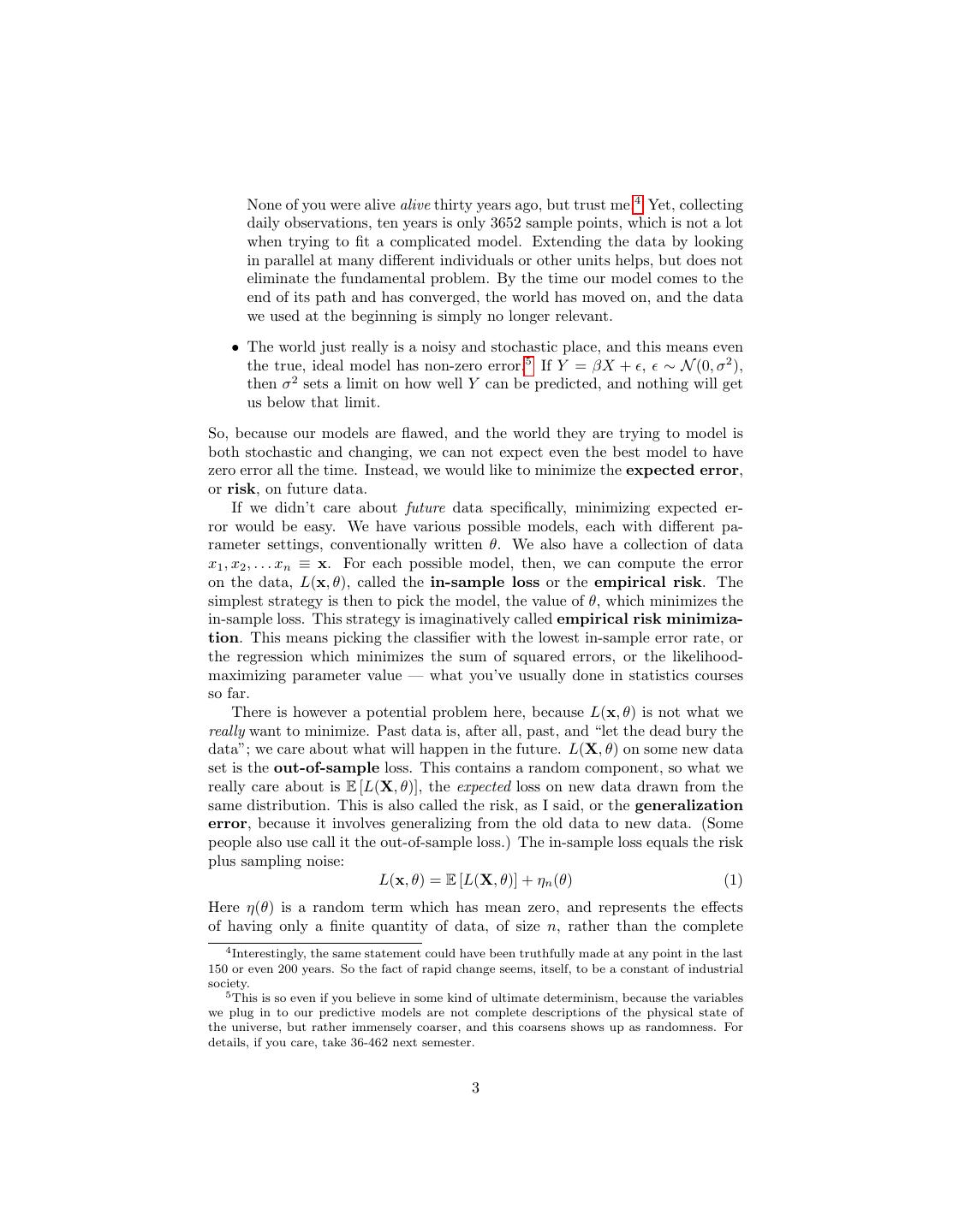 3 . None of you were alive alive thirty years ago, but trust me.4 Yet, collecting daily observations, ten years is only 3652 sample points, which is not a lot when trying to fit a complicated model. Extending the data by looking in parallel at many different individuals or other units helps, but does not eliminate the fundamental problem. By the time our model comes to the end of its path and has converged, the world has moved on, and the data we used at the beginning is simply no longer relevant. • The world just really is a noisy and stochastic place, and this means even the true, ideal model has non-zero error.5 If Y = βX + , ∼ N (0, σ 2 ), then σ 2 sets a limit on how well Y can be predicted, and nothing will get us below that limit. So, because our models are flawed, and the world they are trying to model is both stochastic and changing, we can not expect even the best model to have zero error all the time. Instead, we would like to minimize the expected error, or risk, on future data. If we didn’t care about future data specifically, minimizing expected er- ror would be easy. We have various possible models, each with different pa- rameter settings, conventionally written θ. We also have a collection of data x1 , x2 , . . . xn ≡ x. For each possible model, then, we can compute the error on the data, L(x, θ), called the in-sample loss or the empirical risk. The simplest strategy is then to pick the model, the value of θ, which minimizes the in-sample loss. This strategy is imaginatively called empirical risk minimiza- tion. This means picking the classifier with the lowest in-sample error rate, or the regression which minimizes the sum of squared errors, or the likelihood- maximizing parameter value — what you’ve usually done in statistics courses so far. There is however a potential problem here, because L(x, θ) is not what we really want to minimize. Past data is, after all, past, and “let the dead bury the data”; we care about what will happen in the future. L(X, θ) on some new data set is the out-of-sample loss. This contains a random component, so what we really care about is E [L(X, θ)], the expected loss on new data drawn from the same distribution. This is also called the risk, as I said, or the generalization error, because it involves generalizing from the old data to new data. (Some people also use call it the out-of-sample loss.) The in-sample loss equals the risk plus sampling noise: L(x, θ) = E [L(X, θ)] + ηn (θ) (1) Here η(θ) is a random term which has mean zero, and represents the effects of having only a finite quantity of data, of size n, rather than the complete 4 Interestingly, the same statement could have been truthfully made at any point in the last 150 or even 200 years. So the fact of rapid change seems, itself, to be a constant of industrial society. 5 This is so even if you believe in some kind of ultimate determinism, because the variables we plug in to our predictive models are not complete descriptions of the physical state of the universe, but rather immensely coarser, and this coarsens shows up as randomness. For details, if you care, take 36-462 next semester. 3