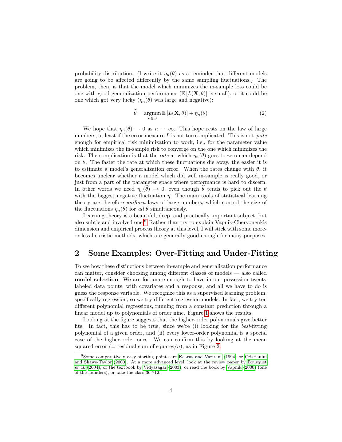 4 .probability distribution. (I write it ηn (θ) as a reminder that different models are going to be affected differently by the same sampling fluctuations.) The problem, then, is that the model which minimizes the in-sample loss could be one with good generalization performance (E [L(X, θ)] is small), or it could be one which got very lucky (ηn (θ) was large and negative): θ = argmin E [L(X, θ)] + ηn (θ) (2) θ∈Θ We hope that ηn (θ) → 0 as n → ∞. This hope rests on the law of large numbers, at least if the error measure L is not too complicated. This is not quite enough for empirical risk minimization to work, i.e., for the parameter value which minimizes the in-sample risk to converge on the one which minimizes the risk. The complication is that the rate at which ηn (θ) goes to zero can depend on θ. The faster the rate at which these fluctuations die away, the easier it is to estimate a model’s generalization error. When the rates change with θ, it becomes unclear whether a model which did well in-sample is really good, or just from a part of the parameter space where performance is hard to discern. In other words we need ηn (θ) → 0, even though θ tends to pick out the θ with the biggest negative fluctuation η. The main tools of statistical learning theory are therefore uniform laws of large numbers, which control the size of the fluctuations ηn (θ) for all θ simultaneously. Learning theory is a beautiful, deep, and practically important subject, but also subtle and involved one.6 Rather than try to explain Vapnik-Chervonenkis dimension and empirical process theory at this level, I will stick with some more- or-less heuristic methods, which are generally good enough for many purposes. 2 Some Examples: Over-Fitting and Under-Fitting To see how these distinctions between in-sample and generalization performance can matter, consider choosing among different classes of models — also called model selection. We are fortunate enough to have in our possession twenty labeled data points, with covariates and a response, and all we have to do is guess the response variable. We recognize this as a supervised learning problem, specifically regression, so we try different regression models. In fact, we try ten different polynomial regressions, running from a constant prediction through a linear model up to polynomials of order nine. Figure 1 shows the results. Looking at the figure suggests that the higher-order polynomials give better fits. In fact, this has to be true, since we’re (i) looking for the best-fitting polynomial of a given order, and (ii) every lower-order polynomial is a special case of the higher-order ones. We can confirm this by looking at the mean squared error (= residual sum of squares/n), as in Figure 2. 6 Some comparatively easy starting points are Kearns and Vazirani (1994) or Cristianini and Shawe-Taylor (2000). At a more advanced level, look at the review paper by Bousquet et al. (2004), or the textbook by Vidyasagar (2003), or read the book by Vapnik (2000) (one of the founders), or take the class 36-712. 4