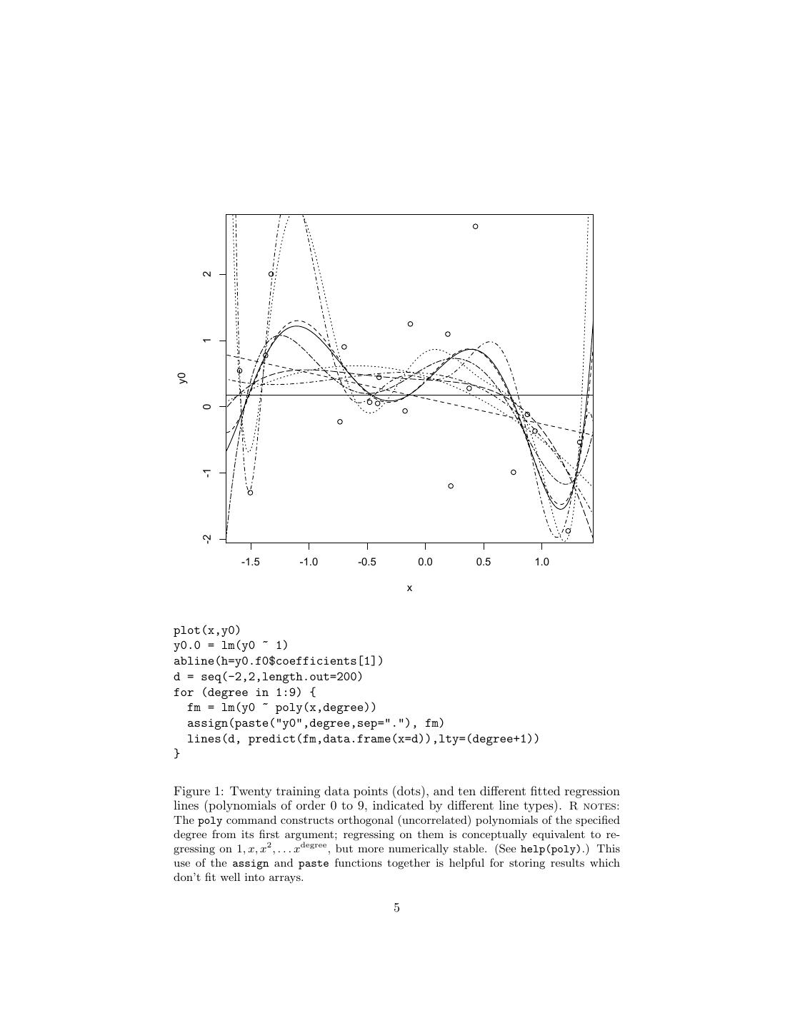 5 . 2 1 y0 0 -1 -2 -1.5 -1.0 -0.5 0.0 0.5 1.0 x plot(x,y0) y0.0 = lm(y0 ~ 1) abline(h=y0.f0$coefficients[1]) d = seq(-2,2,length.out=200) for (degree in 1:9) { fm = lm(y0 ~ poly(x,degree)) assign(paste("y0",degree,sep="."), fm) lines(d, predict(fm,data.frame(x=d)),lty=(degree+1)) } Figure 1: Twenty training data points (dots), and ten different fitted regression lines (polynomials of order 0 to 9, indicated by different line types). R notes: The poly command constructs orthogonal (uncorrelated) polynomials of the specified degree from its first argument; regressing on them is conceptually equivalent to re- gressing on 1, x, x2 , . . . xdegree , but more numerically stable. (See help(poly).) This use of the assign and paste functions together is helpful for storing results which don’t fit well into arrays. 5