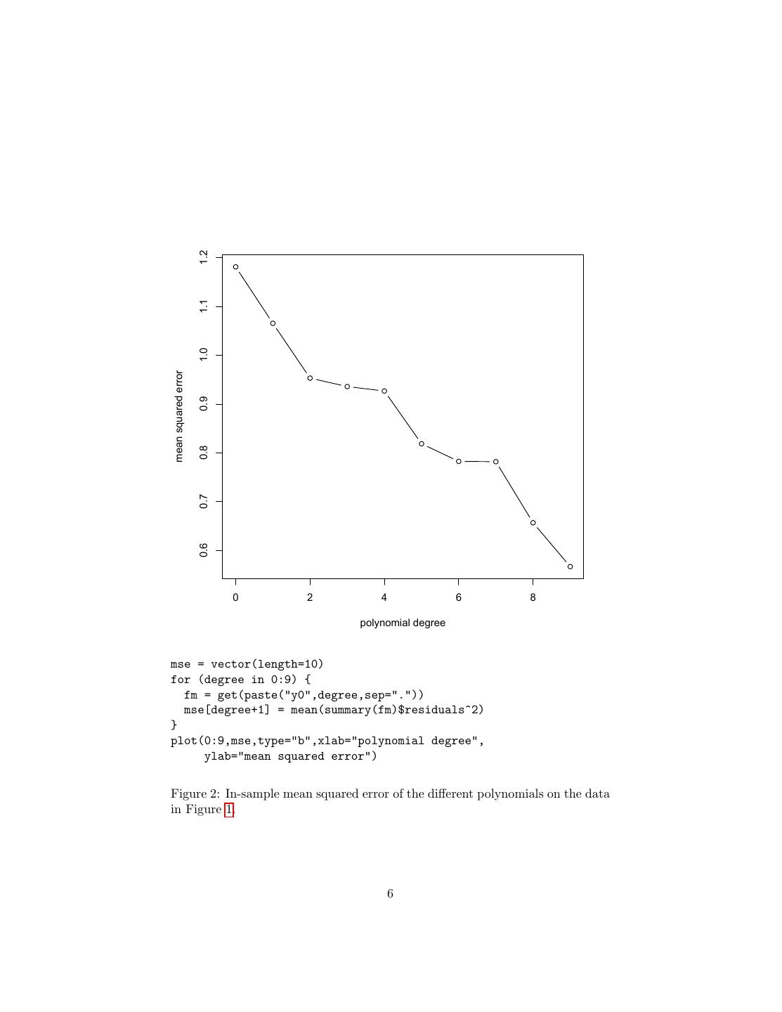 6 . 1.2 1.1 1.0 mean squared error 0.9 0.8 0.7 0.6 0 2 4 6 8 polynomial degree mse = vector(length=10) for (degree in 0:9) { fm = get(paste("y0",degree,sep=".")) mse[degree+1] = mean(summary(fm)$residuals^2) } plot(0:9,mse,type="b",xlab="polynomial degree", ylab="mean squared error") Figure 2: In-sample mean squared error of the different polynomials on the data in Figure 1. 6