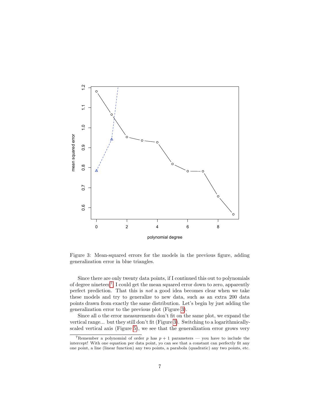 7 . 1.2 1.1 1.0 mean squared error 0.9 0.8 0.7 0.6 0 2 4 6 8 polynomial degree Figure 3: Mean-squared errors for the models in the previous figure, adding generalization error in blue triangles. Since there are only twenty data points, if I continued this out to polynomials of degree nineteen7 , I could get the mean squared error down to zero, apparently perfect prediction. That this is not a good idea becomes clear when we take these models and try to generalize to new data, such as an extra 200 data points drawn from exactly the same distribution. Let’s begin by just adding the generalization error to the previous plot (Figure 3). Since all o the error measurements don’t fit on the same plot, we expand the vertical range... but they still don’t fit (Figure 3). Switching to a logarithmically- scaled vertical axis (Figure 5), we see that the generalization error grows very 7 Remember a polynomial of order p has p + 1 parameters — you have to include the intercept! With one equation per data point, yo can see that a constant can perfectly fit any one point, a line (linear function) any two points, a parabola (quadratic) any two points, etc. 7