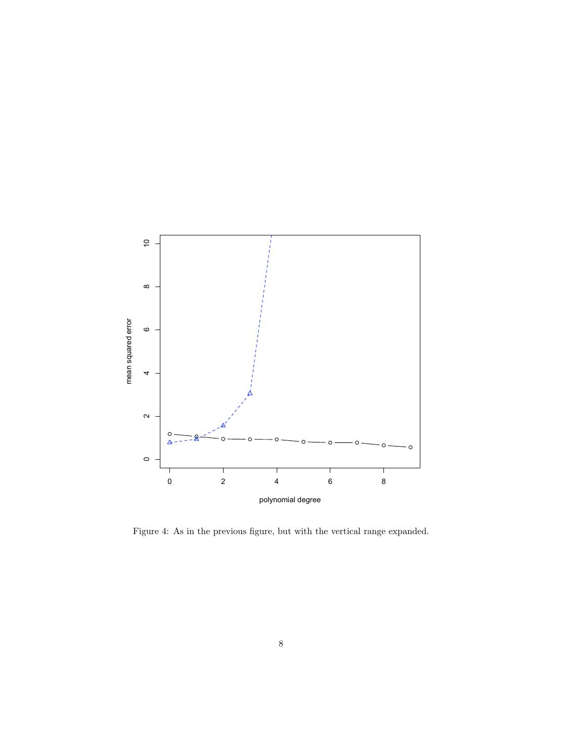 8 . 10 8 mean squared error 6 4 2 0 0 2 4 6 8 polynomial degree Figure 4: As in the previous figure, but with the vertical range expanded. 8