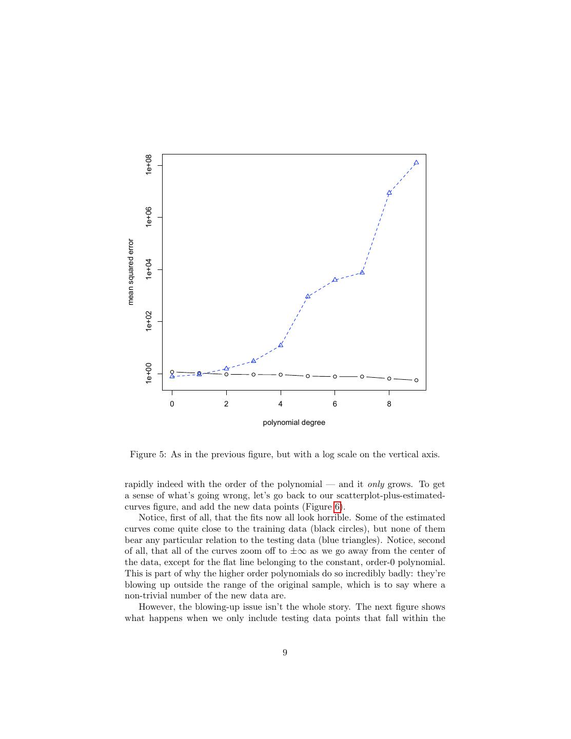 9 . 1e+08 1e+06 mean squared error 1e+04 1e+02 1e+00 0 2 4 6 8 polynomial degree Figure 5: As in the previous figure, but with a log scale on the vertical axis. rapidly indeed with the order of the polynomial — and it only grows. To get a sense of what’s going wrong, let’s go back to our scatterplot-plus-estimated- curves figure, and add the new data points (Figure 6). Notice, first of all, that the fits now all look horrible. Some of the estimated curves come quite close to the training data (black circles), but none of them bear any particular relation to the testing data (blue triangles). Notice, second of all, that all of the curves zoom off to ±∞ as we go away from the center of the data, except for the flat line belonging to the constant, order-0 polynomial. This is part of why the higher order polynomials do so incredibly badly: they’re blowing up outside the range of the original sample, which is to say where a non-trivial number of the new data are. However, the blowing-up issue isn’t the whole story. The next figure shows what happens when we only include testing data points that fall within the 9