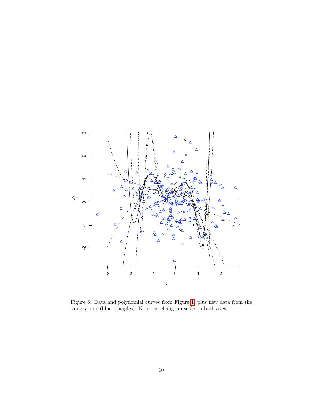 10 . 3 2 1 y0 0 -1 -2 -3 -2 -1 0 1 2 x Figure 6: Data and polynomial curves from Figure 1, plus new data from the same source (blue triangles). Note the change in scale on both axes. 10