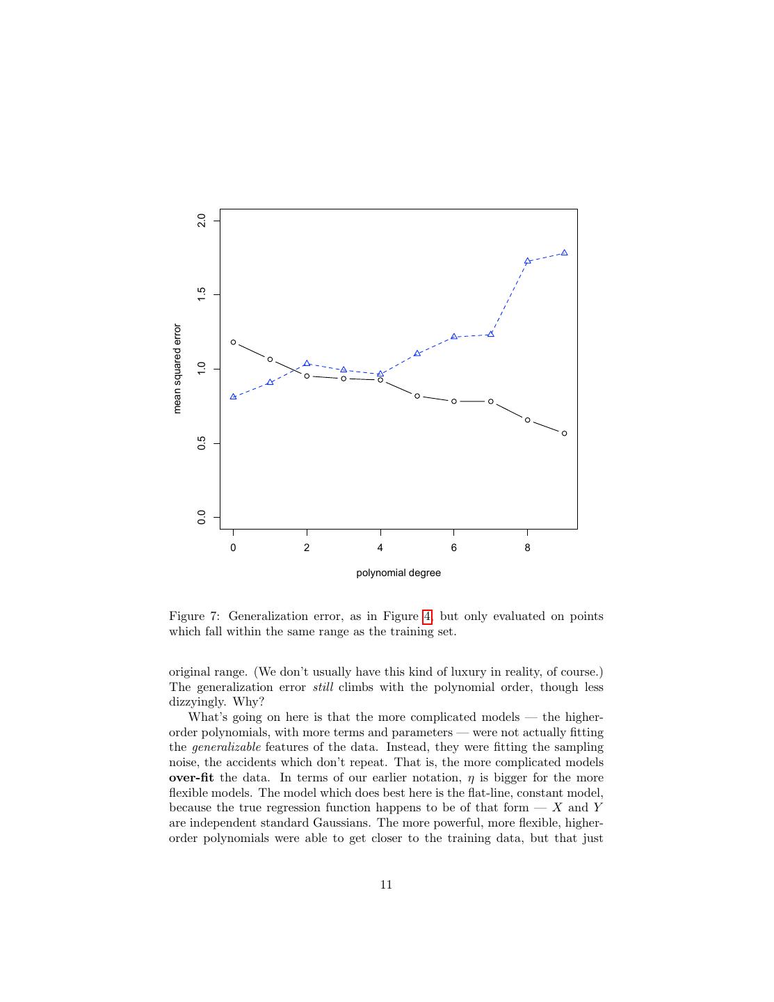 11 . 2.0 1.5 mean squared error 1.0 0.5 0.0 0 2 4 6 8 polynomial degree Figure 7: Generalization error, as in Figure 4, but only evaluated on points which fall within the same range as the training set. original range. (We don’t usually have this kind of luxury in reality, of course.) The generalization error still climbs with the polynomial order, though less dizzyingly. Why? What’s going on here is that the more complicated models — the higher- order polynomials, with more terms and parameters — were not actually fitting the generalizable features of the data. Instead, they were fitting the sampling noise, the accidents which don’t repeat. That is, the more complicated models over-fit the data. In terms of our earlier notation, η is bigger for the more flexible models. The model which does best here is the flat-line, constant model, because the true regression function happens to be of that form — X and Y are independent standard Gaussians. The more powerful, more flexible, higher- order polynomials were able to get closer to the training data, but that just 11