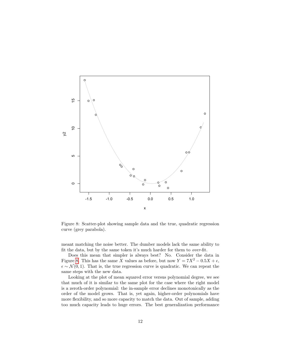 12 . 15 10 y2 5 0 -1.5 -1.0 -0.5 0.0 0.5 1.0 x Figure 8: Scatter-plot showing sample data and the true, quadratic regression curve (grey parabola). meant matching the noise better. The dumber models lack the same ability to fit the data, but by the same token it’s much harder for them to over-fit. Does this mean that simpler is always best? No. Consider the data in Figure 8. This has the same X values as before, but now Y = 7X 2 − 0.5X + , ∼ N (0, 1). That is, the true regression curve is quadratic. We can repeat the same steps with the new data. Looking at the plot of mean squared error versus polynomial degree, we see that much of it is similar to the same plot for the case where the right model is a zeroth-order polynomial: the in-sample error declines monotonically as the order of the model grows. That is, yet again, higher-order polynomials have more flexibility, and so more capacity to match the data. Out of sample, adding too much capacity leads to huge errors. The best generalization performance 12