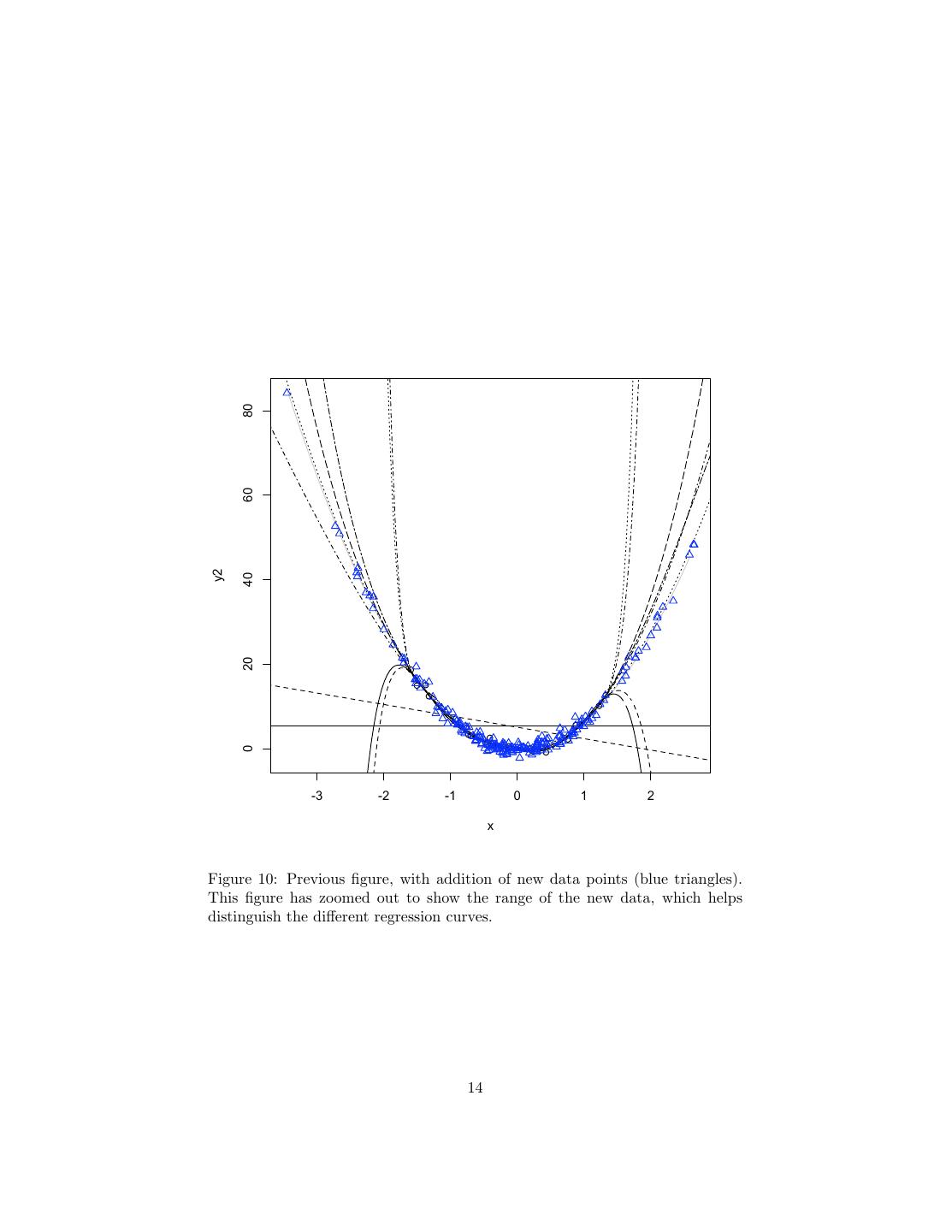 14 . 80 60 y2 40 20 0 -3 -2 -1 0 1 2 x Figure 10: Previous figure, with addition of new data points (blue triangles). This figure has zoomed out to show the range of the new data, which helps distinguish the different regression curves. 14