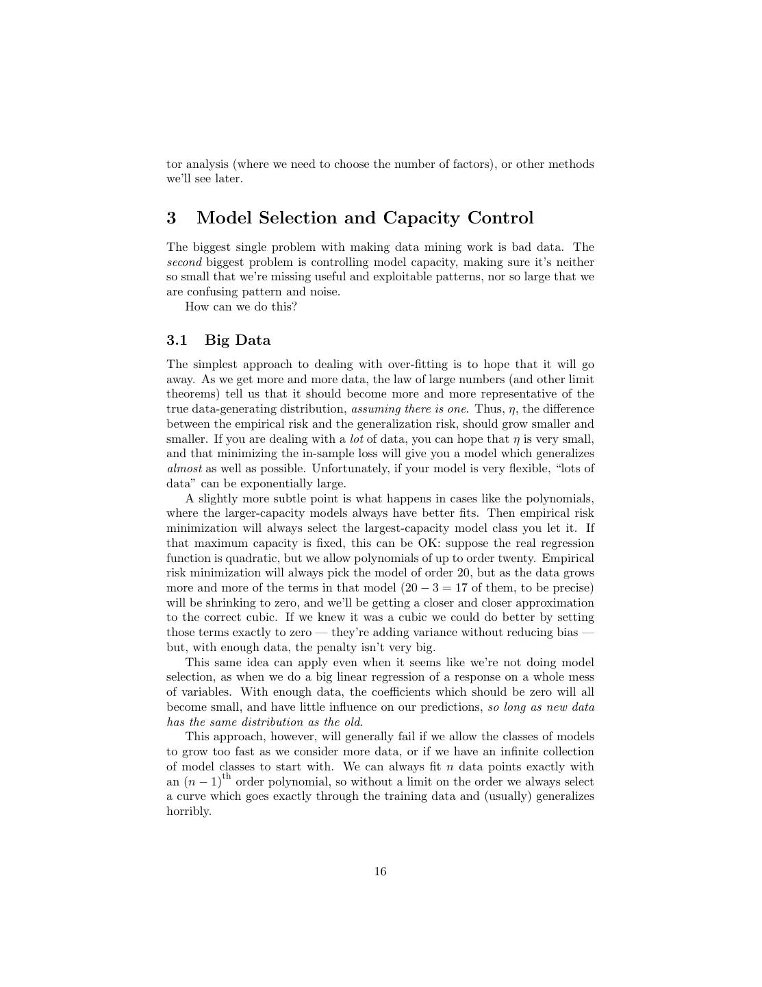 16 .tor analysis (where we need to choose the number of factors), or other methods we’ll see later. 3 Model Selection and Capacity Control The biggest single problem with making data mining work is bad data. The second biggest problem is controlling model capacity, making sure it’s neither so small that we’re missing useful and exploitable patterns, nor so large that we are confusing pattern and noise. How can we do this? 3.1 Big Data The simplest approach to dealing with over-fitting is to hope that it will go away. As we get more and more data, the law of large numbers (and other limit theorems) tell us that it should become more and more representative of the true data-generating distribution, assuming there is one. Thus, η, the difference between the empirical risk and the generalization risk, should grow smaller and smaller. If you are dealing with a lot of data, you can hope that η is very small, and that minimizing the in-sample loss will give you a model which generalizes almost as well as possible. Unfortunately, if your model is very flexible, “lots of data” can be exponentially large. A slightly more subtle point is what happens in cases like the polynomials, where the larger-capacity models always have better fits. Then empirical risk minimization will always select the largest-capacity model class you let it. If that maximum capacity is fixed, this can be OK: suppose the real regression function is quadratic, but we allow polynomials of up to order twenty. Empirical risk minimization will always pick the model of order 20, but as the data grows more and more of the terms in that model (20 − 3 = 17 of them, to be precise) will be shrinking to zero, and we’ll be getting a closer and closer approximation to the correct cubic. If we knew it was a cubic we could do better by setting those terms exactly to zero — they’re adding variance without reducing bias — but, with enough data, the penalty isn’t very big. This same idea can apply even when it seems like we’re not doing model selection, as when we do a big linear regression of a response on a whole mess of variables. With enough data, the coefficients which should be zero will all become small, and have little influence on our predictions, so long as new data has the same distribution as the old. This approach, however, will generally fail if we allow the classes of models to grow too fast as we consider more data, or if we have an infinite collection of model classes to start with. We can always fit n data points exactly with th an (n − 1) order polynomial, so without a limit on the order we always select a curve which goes exactly through the training data and (usually) generalizes horribly. 16