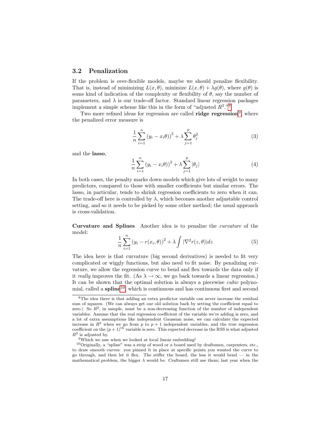 17 .3.2 Penalization If the problem is over-flexible models, maybe we should penalize flexibility. That is, instead of minimizing L(x, θ), minimize L(x, θ) + λg(θ), where g(θ) is some kind of indication of the complexity or flexibility of θ, say the number of parameters, and λ is our trade-off factor. Standard linear regression packages implement a simple scheme like this in the form of “adjusted R2 .”8 Two more refined ideas for regression are called ridge regression9 , where the penalized error measure is n p 1 2 (yi − xi θ)) + λ θj2 (3) n i=1 j=1 and the lasso, n p 1 2 (yi − xi θ)) + λ |θj | (4) n i=1 j=1 In both cases, the penalty marks down models which give lots of weight to many predictors, compared to those with smaller coefficients but similar errors. The lasso, in particular, tends to shrink regression coefficients to zero when it can. The trade-off here is controlled by λ, which becomes another adjustable control setting, and so it needs to be picked by some other method; the usual approach is cross-validation. Curvature and Splines Another idea is to penalize the curvature of the model: n 1 2 (yi − r(xi , θ)) + λ |∇2 r(z, θ)|dz (5) n i=1 The idea here is that curvature (big second derivatives) is needed to fit very complicated or wiggly functions, but also need to fit noise. By penalizing cur- vature, we allow the regression curve to bend and flex towards the data only if it really improves the fit. (As λ → ∞, we go back towards a linear regression.) It can be shown that the optimal solution is always a piecewise cubic polyno- mial, called a spline10 , which is continuous and has continuous first and second 8 The idea there is that adding an extra predictor variable can never increase the residual sum of squares. (We can always get our old solution back by setting the coefficient equal to zero.) So R2 , in sample, must be a non-decreasing function of the number of independent variables. Assume that the real regression coefficient of the variable we’re adding is zero, and a lot of extra assumptions like independent Gaussian noise, we can calculate the expected increase in R2 when we go from p to p + 1 independent variables, and the true regression coefficient on the (p + 1)th variable is zero. This expected decrease in the RSS is what adjusted R2 is adjusted by. 9 Which we saw when we looked at local linear embedding! 10 Originally, a “spline” was a strip of wood or a board used by draftsmen, carpenters, etc., to draw smooth curves: you pinned it in place at specific points you wanted the curve to go through, and then let it flex. The stiffer the board, the less it would bend — in the mathematical problem, the bigger λ would be. Craftsmen still use them; last year when the 17