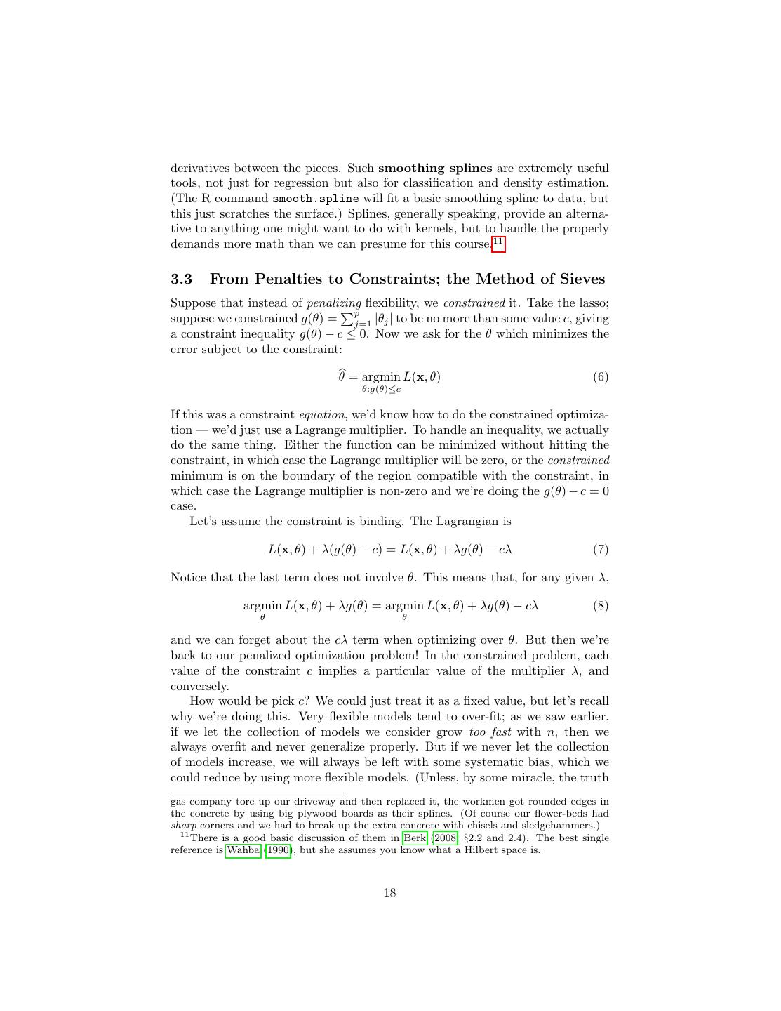 18 .derivatives between the pieces. Such smoothing splines are extremely useful tools, not just for regression but also for classification and density estimation. (The R command smooth.spline will fit a basic smoothing spline to data, but this just scratches the surface.) Splines, generally speaking, provide an alterna- tive to anything one might want to do with kernels, but to handle the properly demands more math than we can presume for this course.11 3.3 From Penalties to Constraints; the Method of Sieves Suppose that instead of penalizing flexibility, we constrained it. Take the lasso; p suppose we constrained g(θ) = j=1 |θj | to be no more than some value c, giving a constraint inequality g(θ) − c ≤ 0. Now we ask for the θ which minimizes the error subject to the constraint: θ = argmin L(x, θ) (6) θ:g(θ)≤c If this was a constraint equation, we’d know how to do the constrained optimiza- tion — we’d just use a Lagrange multiplier. To handle an inequality, we actually do the same thing. Either the function can be minimized without hitting the constraint, in which case the Lagrange multiplier will be zero, or the constrained minimum is on the boundary of the region compatible with the constraint, in which case the Lagrange multiplier is non-zero and we’re doing the g(θ) − c = 0 case. Let’s assume the constraint is binding. The Lagrangian is L(x, θ) + λ(g(θ) − c) = L(x, θ) + λg(θ) − cλ (7) Notice that the last term does not involve θ. This means that, for any given λ, argmin L(x, θ) + λg(θ) = argmin L(x, θ) + λg(θ) − cλ (8) θ θ and we can forget about the cλ term when optimizing over θ. But then we’re back to our penalized optimization problem! In the constrained problem, each value of the constraint c implies a particular value of the multiplier λ, and conversely. How would be pick c? We could just treat it as a fixed value, but let’s recall why we’re doing this. Very flexible models tend to over-fit; as we saw earlier, if we let the collection of models we consider grow too fast with n, then we always overfit and never generalize properly. But if we never let the collection of models increase, we will always be left with some systematic bias, which we could reduce by using more flexible models. (Unless, by some miracle, the truth gas company tore up our driveway and then replaced it, the workmen got rounded edges in the concrete by using big plywood boards as their splines. (Of course our flower-beds had sharp corners and we had to break up the extra concrete with chisels and sledgehammers.) 11 There is a good basic discussion of them in Berk (2008, §2.2 and 2.4). The best single reference is Wahba (1990), but she assumes you know what a Hilbert space is. 18