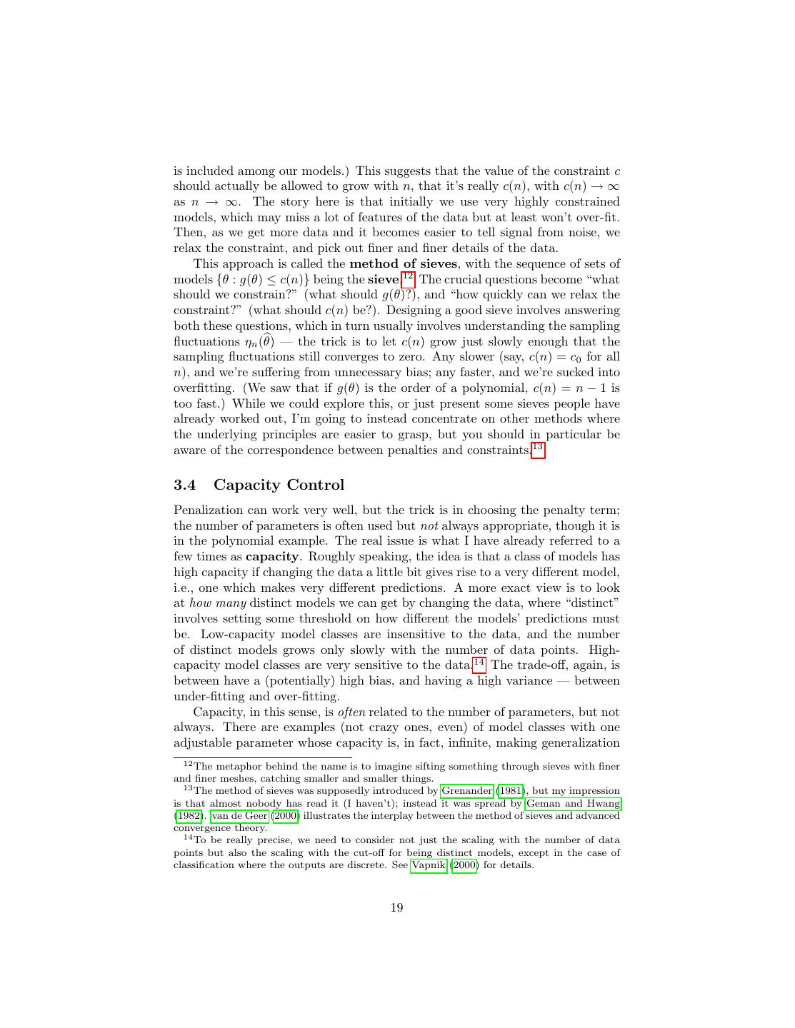 19 .is included among our models.) This suggests that the value of the constraint c should actually be allowed to grow with n, that it’s really c(n), with c(n) → ∞ as n → ∞. The story here is that initially we use very highly constrained models, which may miss a lot of features of the data but at least won’t over-fit. Then, as we get more data and it becomes easier to tell signal from noise, we relax the constraint, and pick out finer and finer details of the data. This approach is called the method of sieves, with the sequence of sets of models {θ : g(θ) ≤ c(n)} being the sieve.12 The crucial questions become “what should we constrain?” (what should g(θ)?), and “how quickly can we relax the constraint?” (what should c(n) be?). Designing a good sieve involves answering both these questions, which in turn usually involves understanding the sampling fluctuations ηn (θ) — the trick is to let c(n) grow just slowly enough that the sampling fluctuations still converges to zero. Any slower (say, c(n) = c0 for all n), and we’re suffering from unnecessary bias; any faster, and we’re sucked into overfitting. (We saw that if g(θ) is the order of a polynomial, c(n) = n − 1 is too fast.) While we could explore this, or just present some sieves people have already worked out, I’m going to instead concentrate on other methods where the underlying principles are easier to grasp, but you should in particular be aware of the correspondence between penalties and constraints.13 3.4 Capacity Control Penalization can work very well, but the trick is in choosing the penalty term; the number of parameters is often used but not always appropriate, though it is in the polynomial example. The real issue is what I have already referred to a few times as capacity. Roughly speaking, the idea is that a class of models has high capacity if changing the data a little bit gives rise to a very different model, i.e., one which makes very different predictions. A more exact view is to look at how many distinct models we can get by changing the data, where “distinct” involves setting some threshold on how different the models’ predictions must be. Low-capacity model classes are insensitive to the data, and the number of distinct models grows only slowly with the number of data points. High- capacity model classes are very sensitive to the data.14 The trade-off, again, is between have a (potentially) high bias, and having a high variance — between under-fitting and over-fitting. Capacity, in this sense, is often related to the number of parameters, but not always. There are examples (not crazy ones, even) of model classes with one adjustable parameter whose capacity is, in fact, infinite, making generalization 12 The metaphor behind the name is to imagine sifting something through sieves with finer and finer meshes, catching smaller and smaller things. 13 The method of sieves was supposedly introduced by Grenander (1981), but my impression is that almost nobody has read it (I haven’t); instead it was spread by Geman and Hwang (1982). van de Geer (2000) illustrates the interplay between the method of sieves and advanced convergence theory. 14 To be really precise, we need to consider not just the scaling with the number of data points but also the scaling with the cut-off for being distinct models, except in the case of classification where the outputs are discrete. See Vapnik (2000) for details. 19