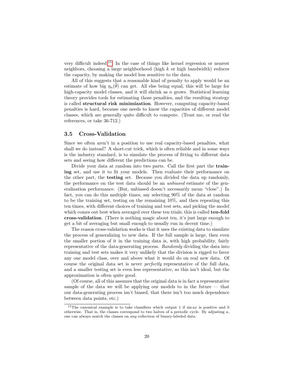 20 .very difficult indeed.15 In the case of things like kernel regression or nearest neighbors, choosing a large neighborhood (high k or high bandwidth) reduces the capacity, by making the model less sensitive to the data. All of this suggests that a reasonable kind of penalty to apply would be an estimate of how big ηn (θ) can get. All else being equal, this will be large for high-capacity model classes, and it will shrink as n grows. Statistical learning theory provides tools for estimating those penalties, and the resulting strategy is called structural risk minimization. However, computing capacity-based penalties is hard, because one needs to know the capacities of different model classes, which are generally quite difficult to compute. (Trust me, or read the references, or take 36-712.) 3.5 Cross-Validation Since we often aren’t in a position to use real capacity-based penalties, what shall we do instead? A short-cut trick, which is often reliable and in some ways is the industry standard, is to simulate the process of fitting to different data sets and seeing how different the predictions can be. Divide your data at random into two parts. Call the first part the train- ing set, and use it to fit your models. Then evaluate their performance on the other part, the testing set. Because you divided the data up randomly, the performance on the test data should be an unbiased estimate of the gen- eralization performance. (But, unbiased doesn’t necessarily mean “close”.) In fact, you can do this multiple times, say selecting 90% of the data at random to be the training set, testing on the remaining 10%, and then repeating this ten times, with different choices of training and test sets, and picking the model which comes out best when averaged over these ten trials; this is called ten-fold cross-validation. (There is nothing magic about ten, it’s just large enough to get a bit of averaging but small enough to usually run in decent time.) The reason cross-validation works is that it uses the existing data to simulate the process of generalizing to new data. If the full sample is large, then even the smaller portion of it in the training data is, with high probability, fairly representative of the data-generating process. Randomly dividing the data into training and test sets makes it very unlikely that the division is rigged to favor any one model class, over and above what it would do on real new data. Of course the original data set is never perfectly representative of the full data, and a smaller testing set is even less representative, so this isn’t ideal, but the approximation is often quite good. (Of course, all of this assumes that the original data is in fact a representative sample of the data we will be applying our models to in the future — that our data-generating process isn’t biased, that there isn’t too much dependence between data points, etc.) 15 The canonical example is to take classifiers which output 1 if sin ax is positive and 0 otherwise. That is, the classes correspond to two halves of a periodic cycle. By adjusting a, one can always match the classes on any collection of binary-labeled data. 20
