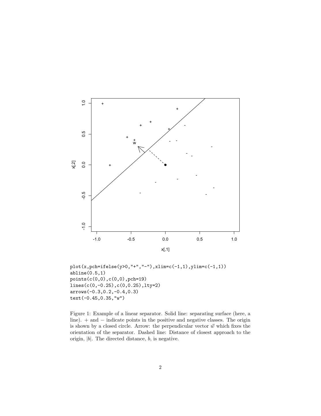 2 . 1.0 + + + + - + 0.5 + + - - w - - - x[,2] 0.0 + - - - - - - -0.5 -1.0 -1.0 -0.5 0.0 0.5 1.0 x[,1] plot(x,pch=ifelse(y>0,"+","-"),xlim=c(-1,1),ylim=c(-1,1)) abline(0.5,1) points(c(0,0),c(0,0),pch=19) lines(c(0,-0.25),c(0,0.25),lty=2) arrows(-0.3,0.2,-0.4,0.3) text(-0.45,0.35,"w") Figure 1: Example of a linear separator. Solid line: separating surface (here, a line). + and − indicate points in the positive and negative classes. The origin is shown by a closed circle. Arrow: the perpendicular vector w which fixes the orientation of the separator. Dashed line: Distance of closest approach to the origin, |b|. The directed distance, b, is negative. 2