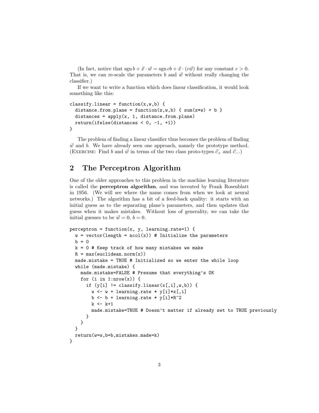 3 . (In fact, notice that sgn b + x · w = sgn cb + x · (cw) for any constant c > 0. That is, we can re-scale the parameters b and w without really changing the classifier.) If we want to write a function which does linear classification, it would look something like this: classify.linear = function(x,w,b) { distance.from.plane = function(z,w,b) { sum(z*w) + b } distances = apply(x, 1, distance.from.plane) return(ifelse(distances < 0, -1, +1)) } The problem of finding a linear classifier thus becomes the problem of finding w and b. We have already seen one approach, namely the prototype method. (Exercise: Find b and w in terms of the two class proto-types c+ and c− .) 2 The Perceptron Algorithm One of the older approaches to this problem in the machine learning literature is called the perceptron algorithm, and was invented by Frank Rosenblatt in 1956. (We will see where the name comes from when we look at neural networks.) The algorithm has a bit of a feed-back quality: it starts with an initial guess as to the separating plane’s parameters, and then updates that guess when it makes mistakes. Without loss of generality, we can take the initial guesses to be w = 0, b = 0. perceptron = function(x, y, learning.rate=1) { w = vector(length = ncol(x)) # Initialize the parameters b = 0 k = 0 # Keep track of how many mistakes we make R = max(euclidean.norm(x)) made.mistake = TRUE # Initialized so we enter the while loop while (made.mistake) { made.mistake=FALSE # Presume that everything’s OK for (i in 1:nrow(x)) { if (y[i] != classify.linear(x[,i],w,b)) { w <- w + learning.rate * y[i]*x[,i] b <- b + learning.rate * y[i]*R^2 k <- k+1 made.mistake=TRUE # Doesn’t matter if already set to TRUE previously } } } return(w=w,b=b,mistakes.made=k) } 3