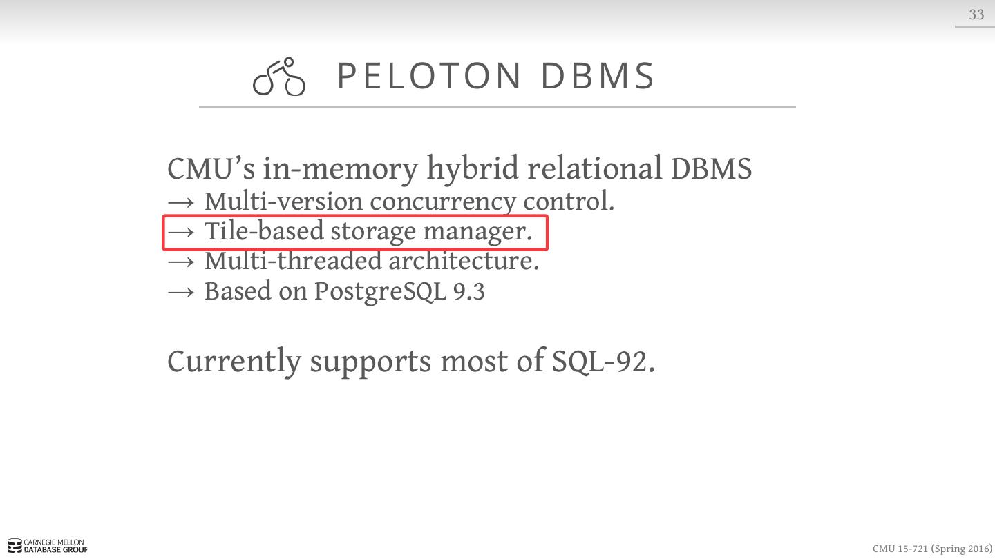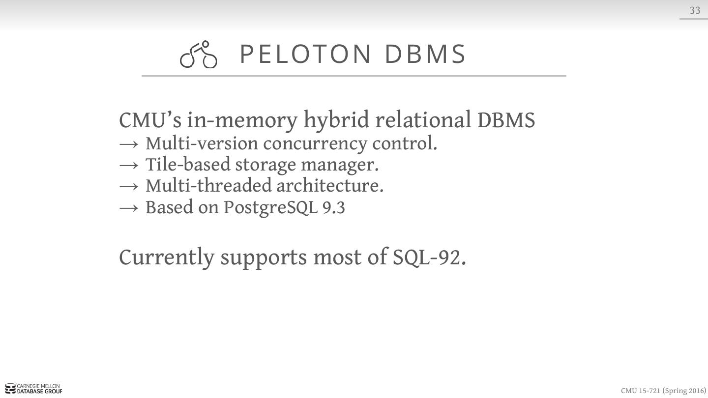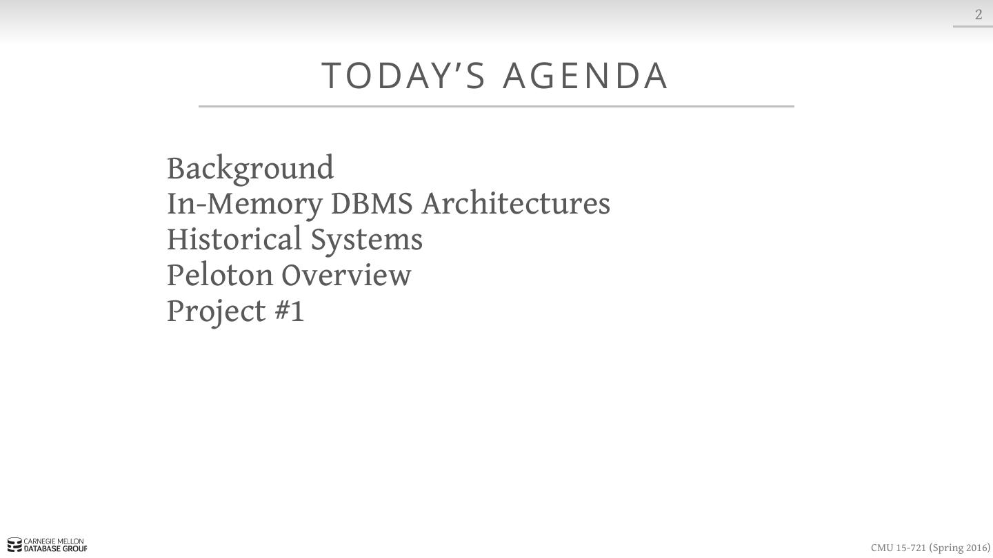 2 . 2 TO DAY ’ S AG E N DA Background In-Memory DBMS Architectures Historical Systems Peloton Overview Project #1 CMU 15-721 (Spring 2016)