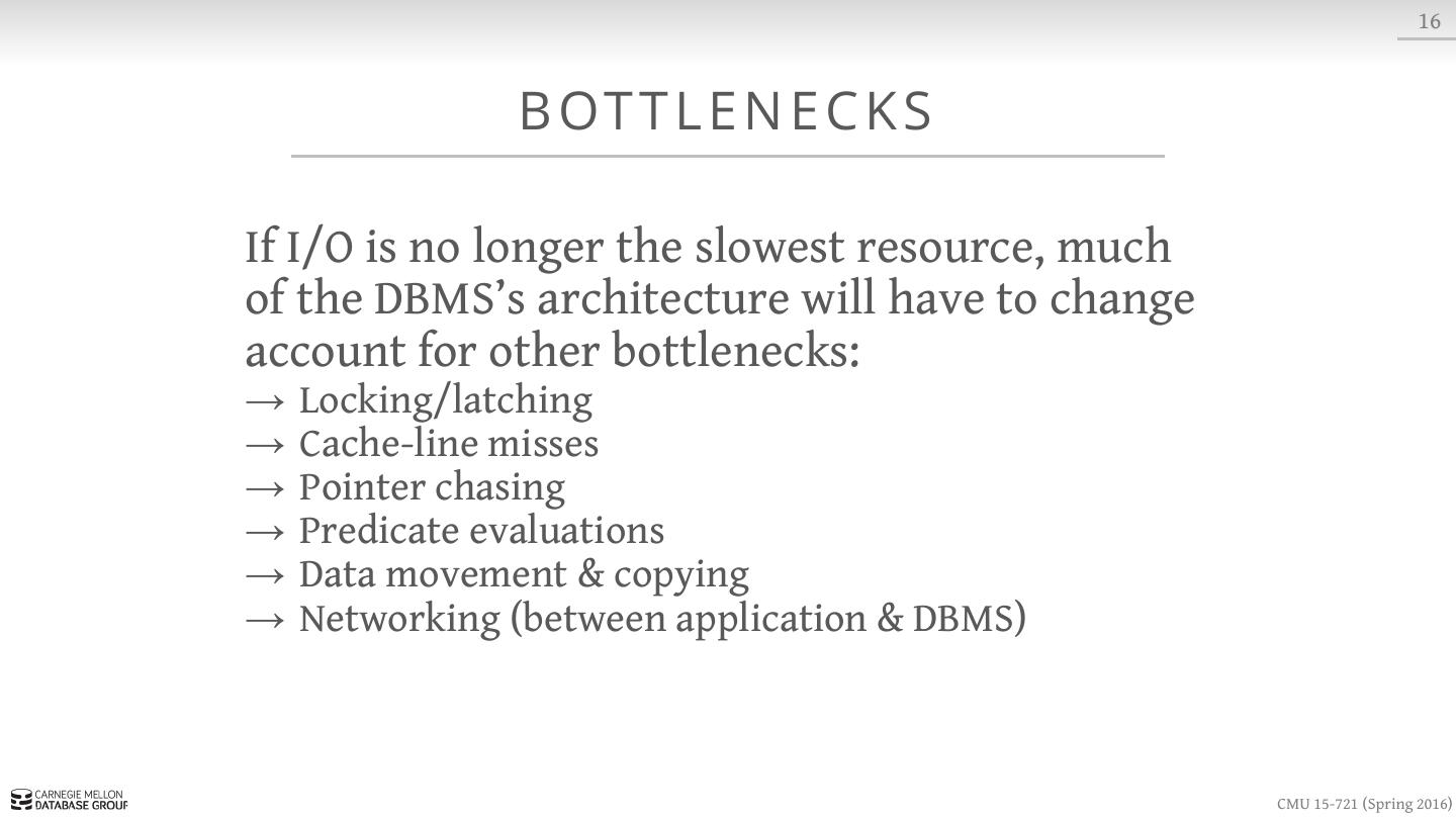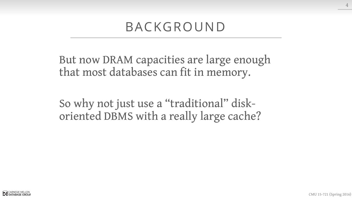 4 . 4 BAC KG R O U N D But now DRAM capacities are large enough that most databases can fit in memory. So why not just use a “traditional” disk- oriented DBMS with a really large cache? CMU 15-721 (Spring 2016)