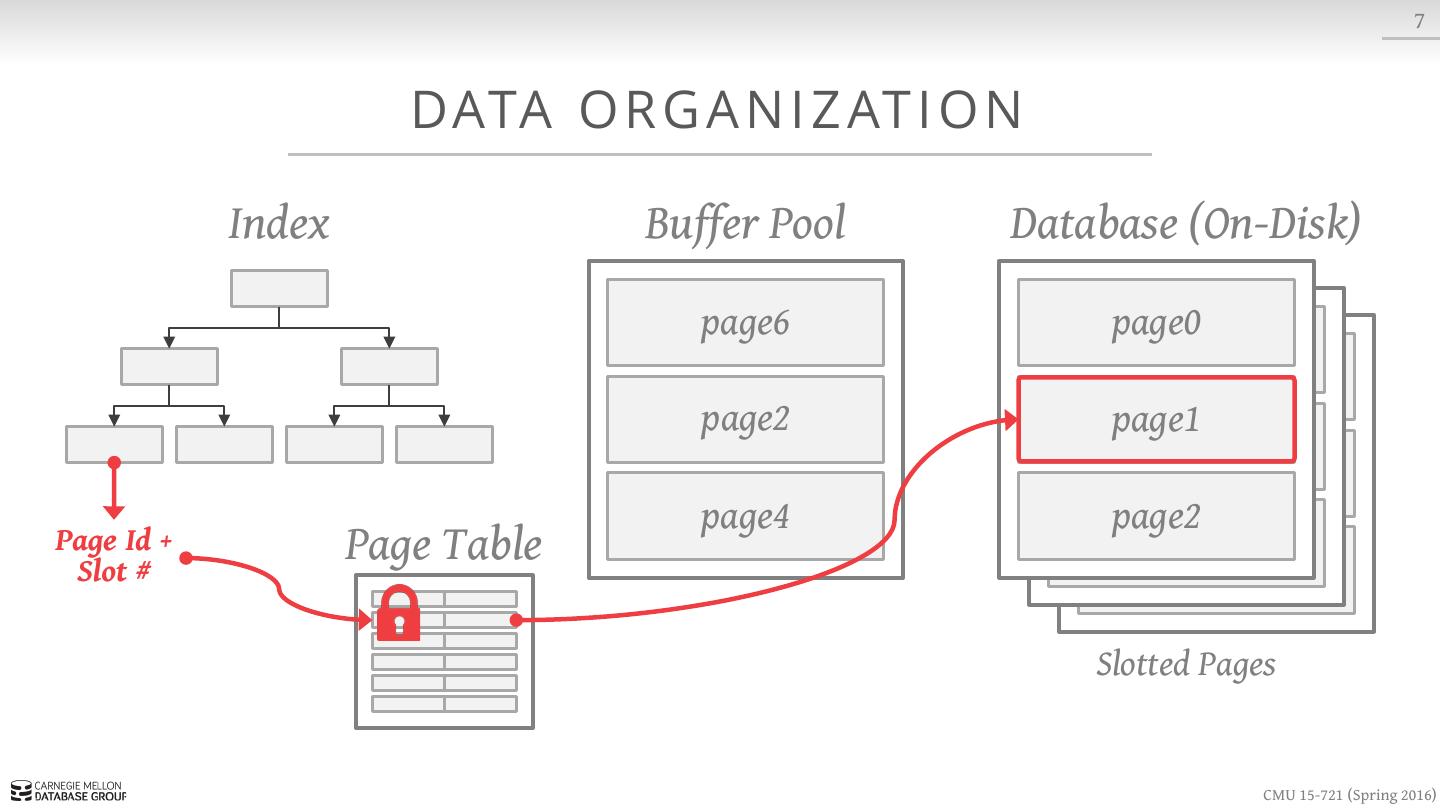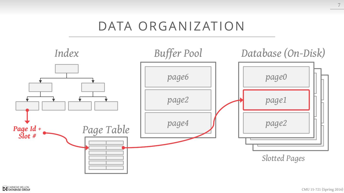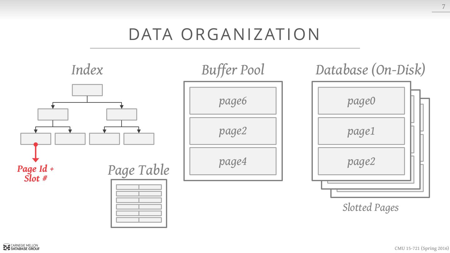 15 . 7 DATA O R G A N I Z AT I O N Index Buffer Pool Database (On-Disk) page6 page0 page1 page1 page4 page2 Page Id + Slot # Page Table Slotted Pages CMU 15-721 (Spring 2016)