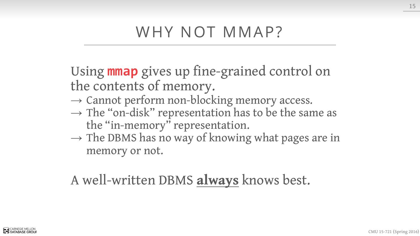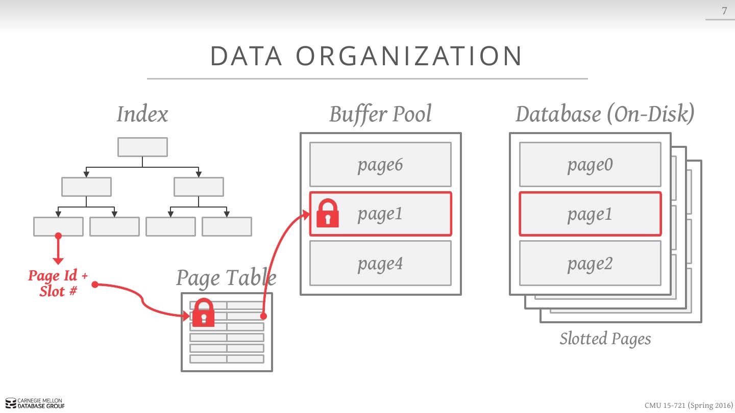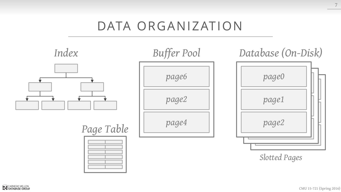 15 . 7 DATA O R G A N I Z AT I O N Index Buffer Pool Database (On-Disk) page6 page0 page1 page1 page4 page2 Page Id + Slot # Page Table Slotted Pages CMU 15-721 (Spring 2016)