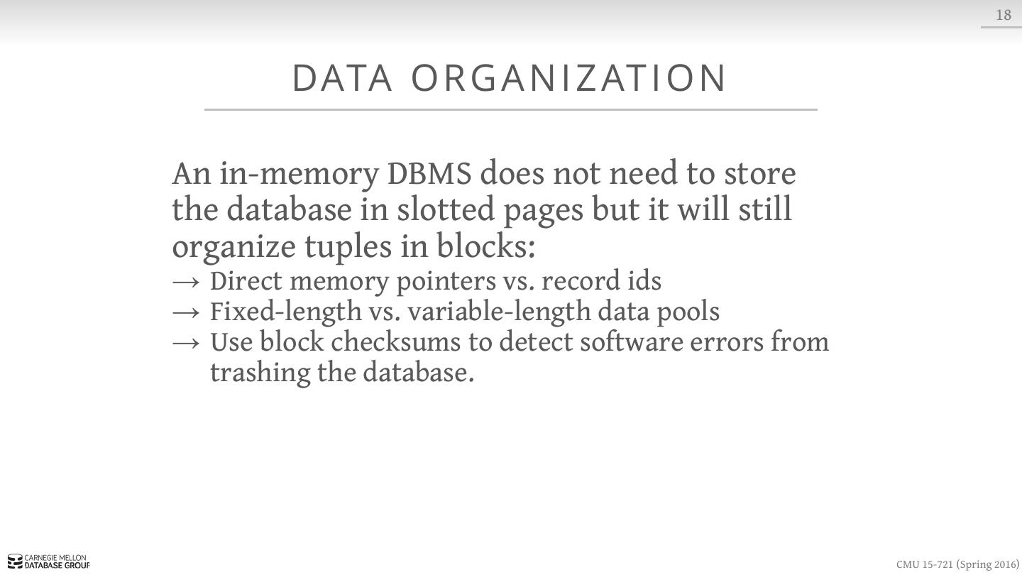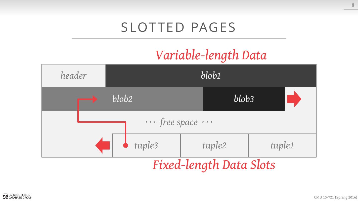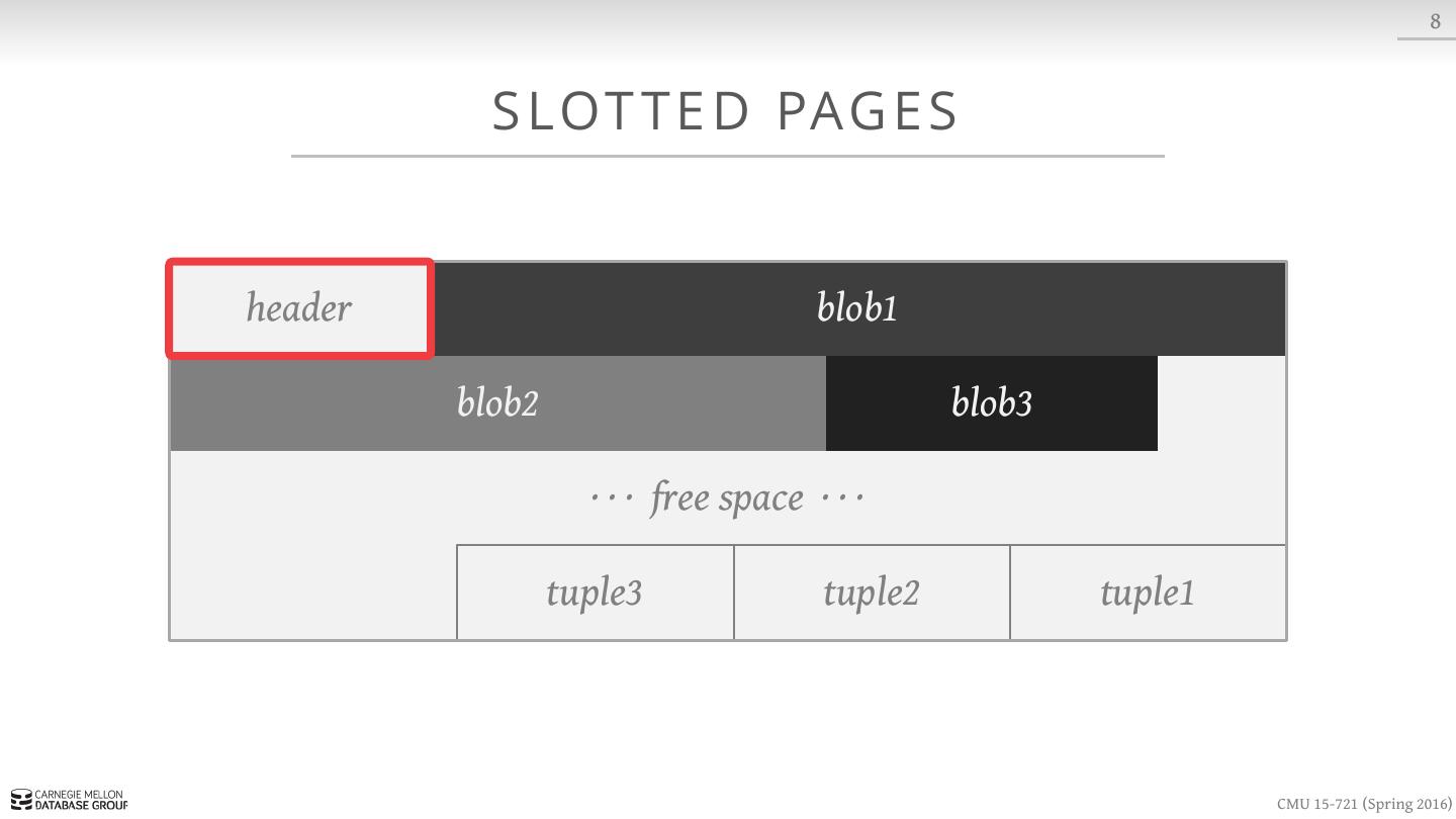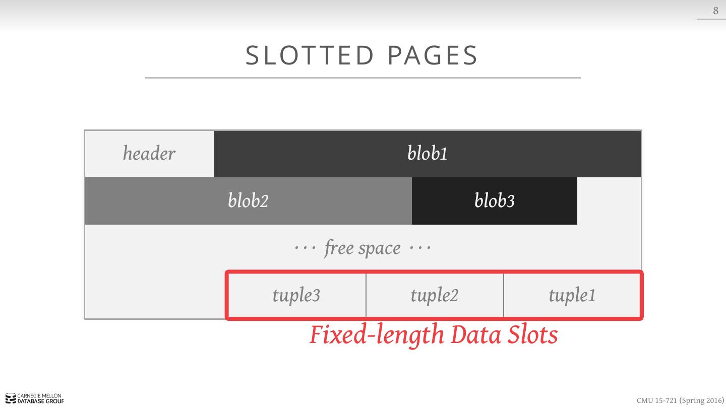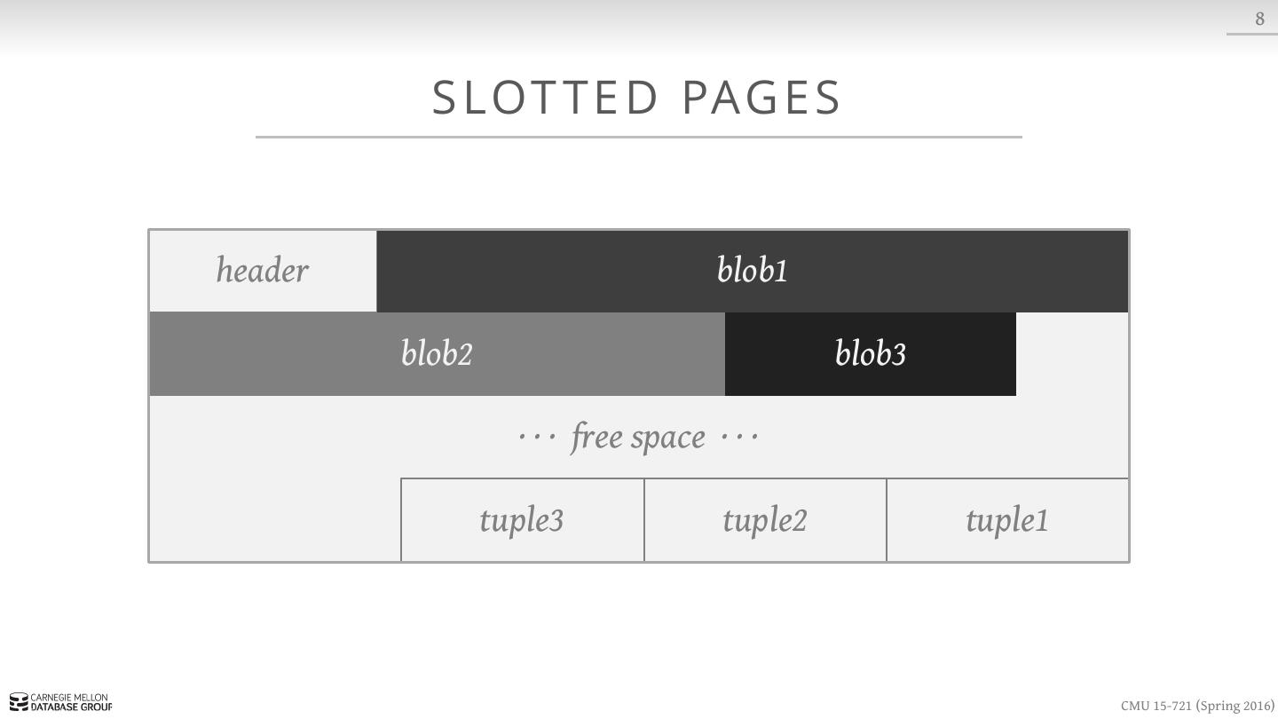 17 . 8 S LOT T E D PAG E S header blob1 blob2 blob3 · · · free space · · · tuple3 tuple2 tuple1 CMU 15-721 (Spring 2016)