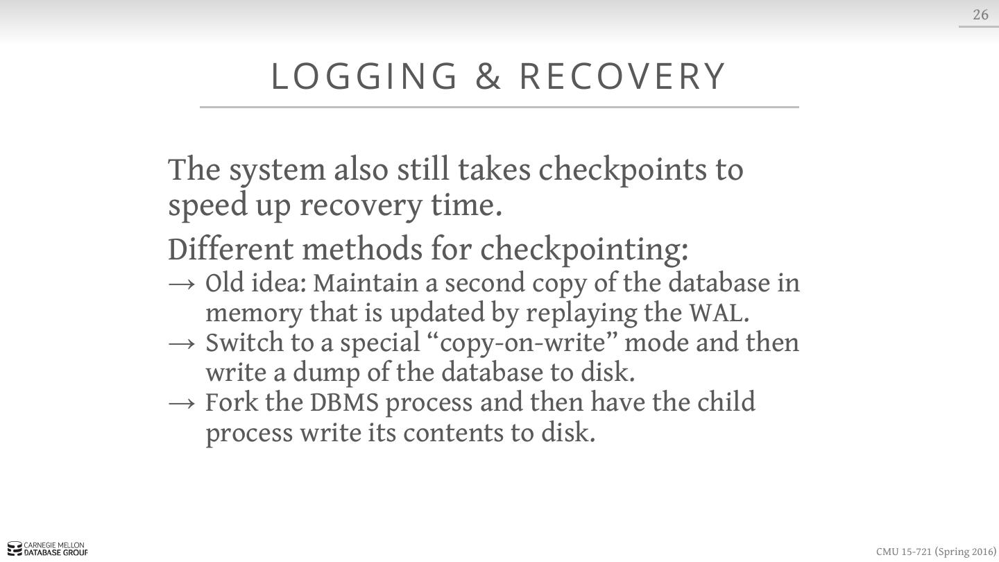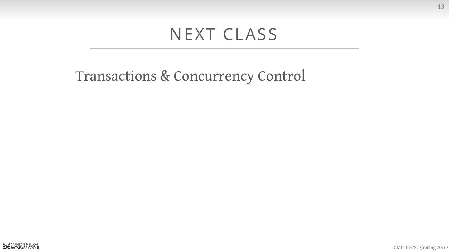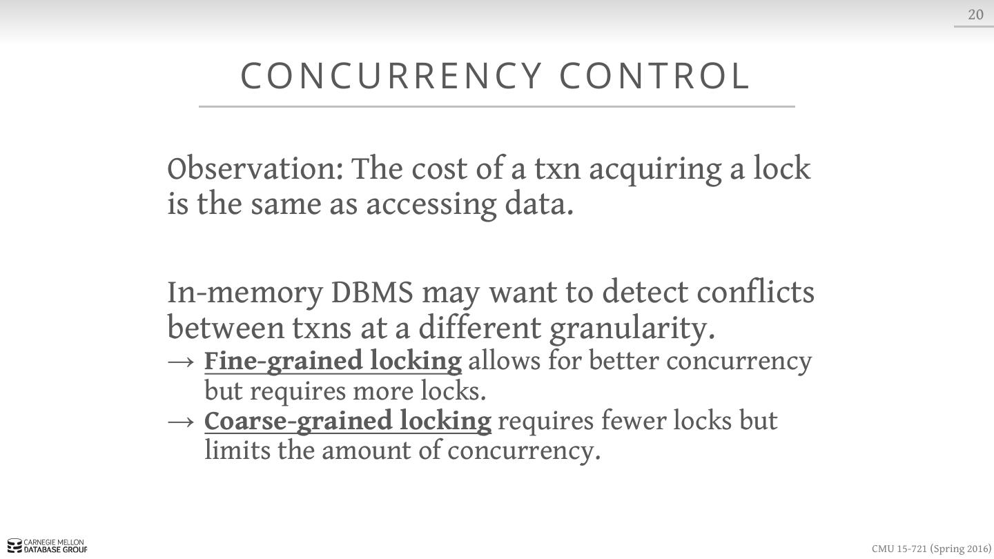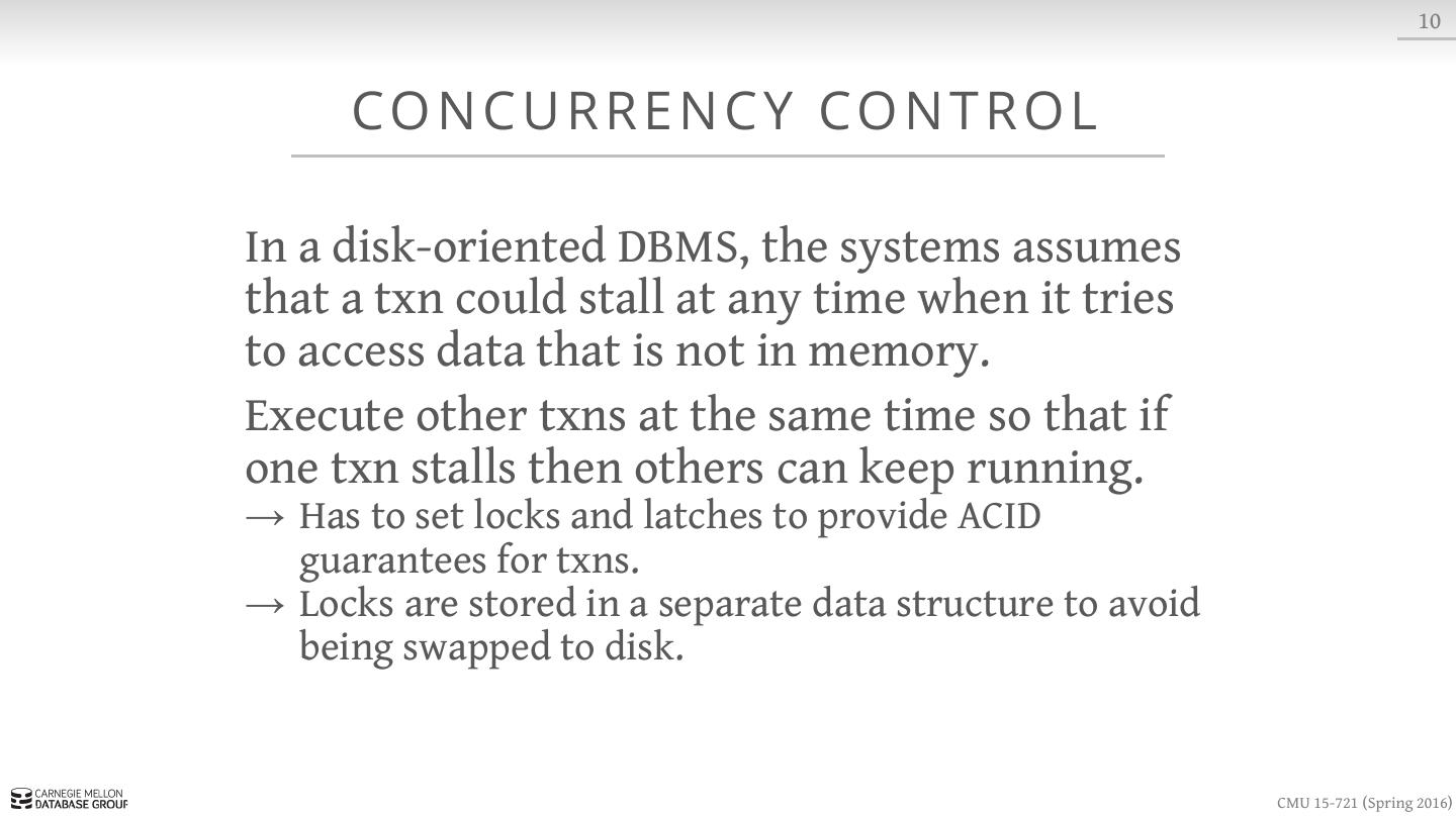 26 . 10 CO N C U R R E N C Y CO N T R O L In a disk-oriented DBMS, the systems assumes that a txn could stall at any time when it tries to access data that is not in memory. Execute other txns at the same time so that if one txn stalls then others can keep running. → Has to set locks and latches to provide ACID guarantees for txns. → Locks are stored in a separate data structure to avoid being swapped to disk. CMU 15-721 (Spring 2016)