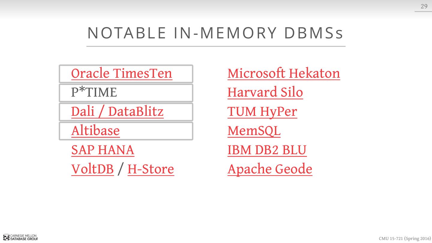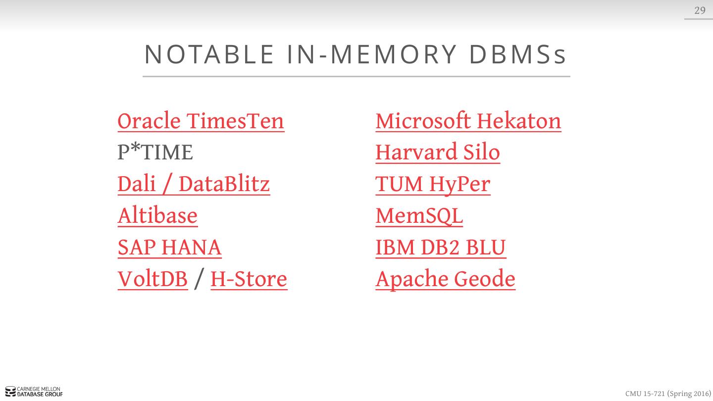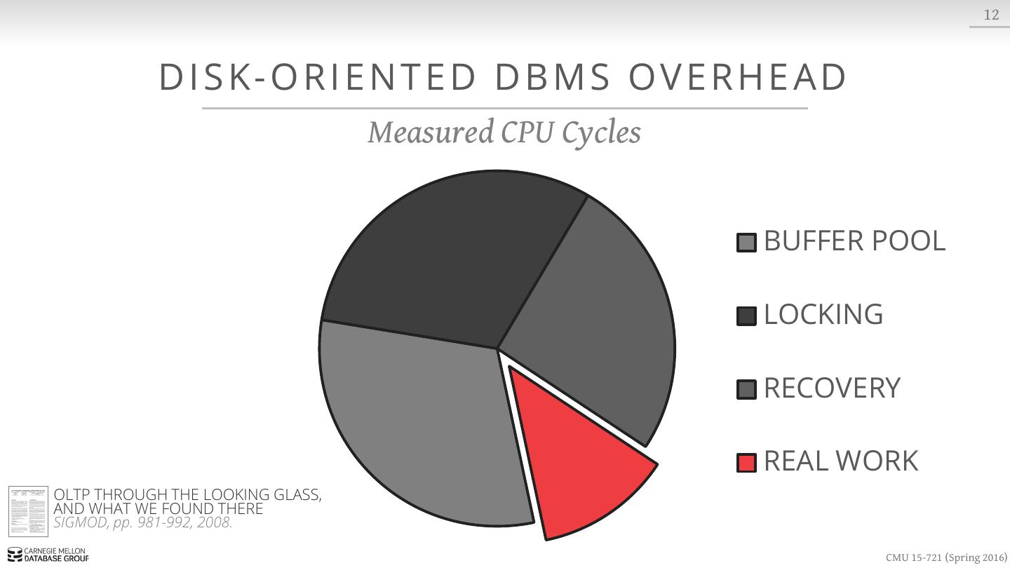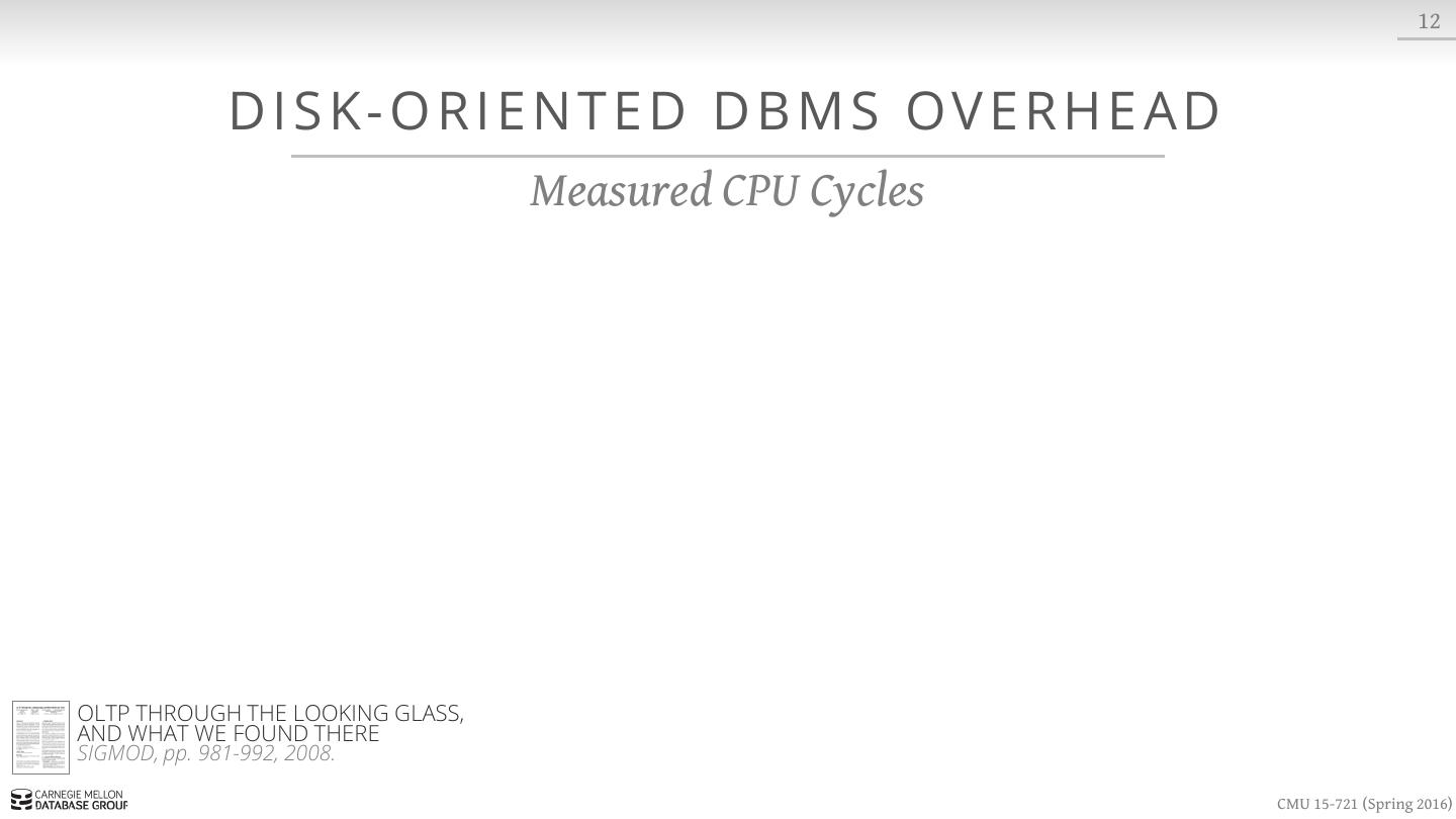 28 . 12 DISK-ORIENTED DBMS OVERHEAD Measured CPU Cycles OLTP THROUGH THE LOOKING GLASS, AND WHAT WE FOUND THERE SIGMOD, pp. 981-992, 2008. CMU 15-721 (Spring 2016)