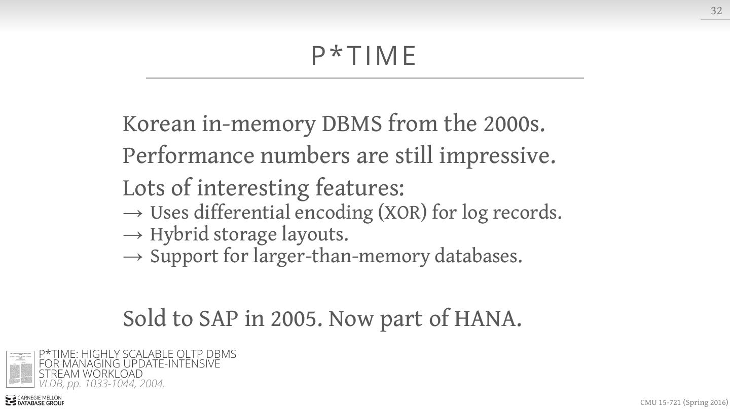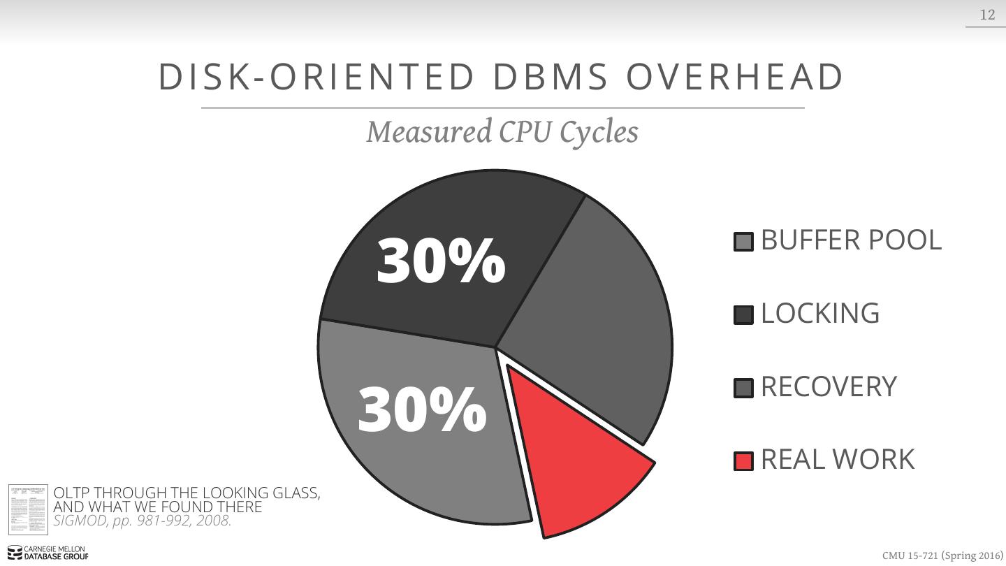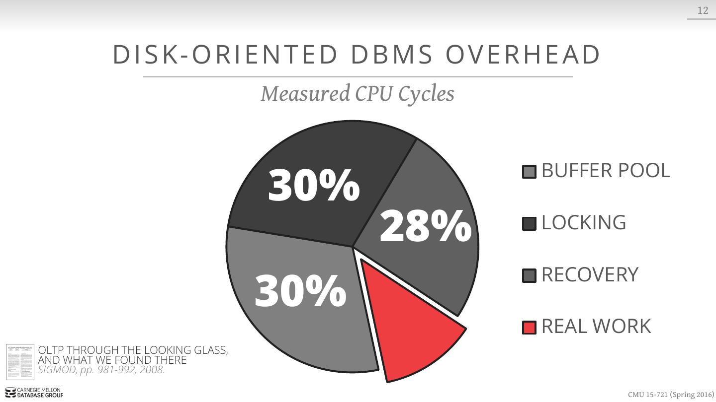 29 . 12 DISK-ORIENTED DBMS OVERHEAD Measured CPU Cycles BUFFER POOL LOCKING RECOVERY REAL WORK OLTP THROUGH THE LOOKING GLASS, AND WHAT WE FOUND THERE SIGMOD, pp. 981-992, 2008. CMU 15-721 (Spring 2016)