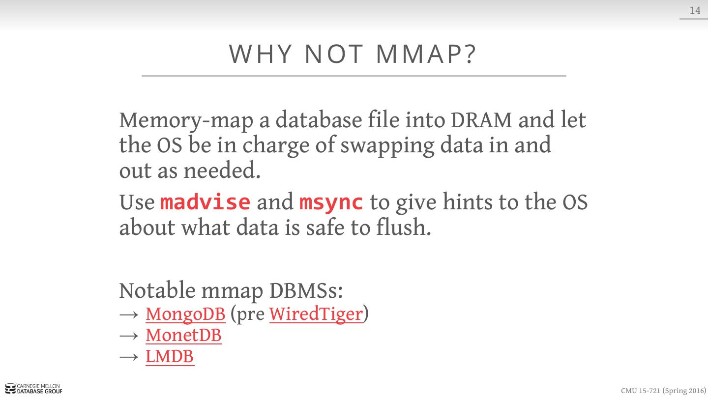 13 . 7 DATA O R G A N I Z AT I O N Index Buffer Pool Database (On-Disk) page6 page0 page2 page1 page4 page2 Page Id + Slot # Page Table Slotted Pages CMU 15-721 (Spring 2016)