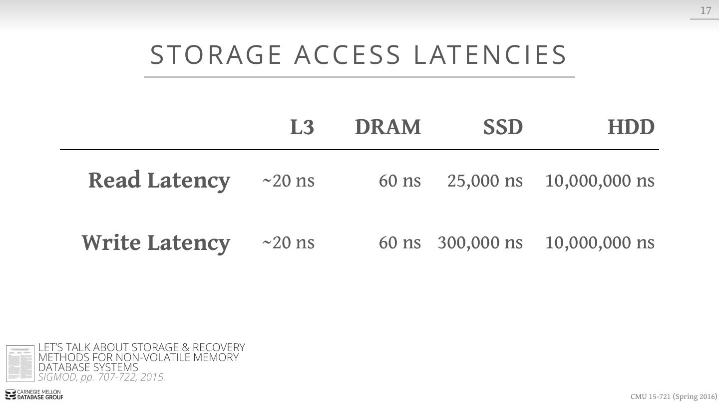 3 . 3 BAC KG R O U N D Much of the history of DBMSs is about avoiding the slowness of disks. Hardware was much different when the original DBMSs were designed: → Uniprocessor (single-core CPU) → RAM was severely limited. → The database had to be stored on disk. CMU 15-721 (Spring 2016)
