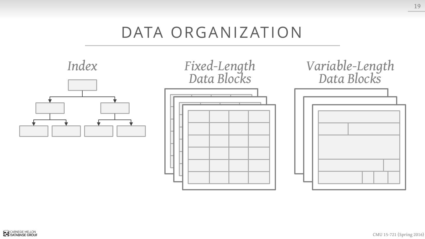 18 . 8 S LOT T E D PAG E S header blob1 blob2 blob3 · · · free space · · · tuple3 tuple2 tuple1 CMU 15-721 (Spring 2016)