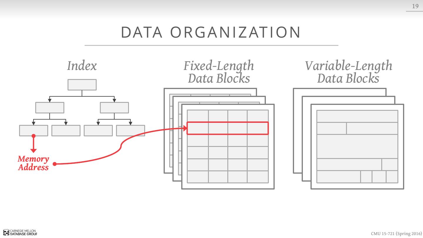 9 . 7 DATA O R G A N I Z AT I O N Index Buffer Pool Database (On-Disk) page6 page0 page2 page1 page4 page2 Page Id + Slot # Page Table Slotted Pages CMU 15-721 (Spring 2016)