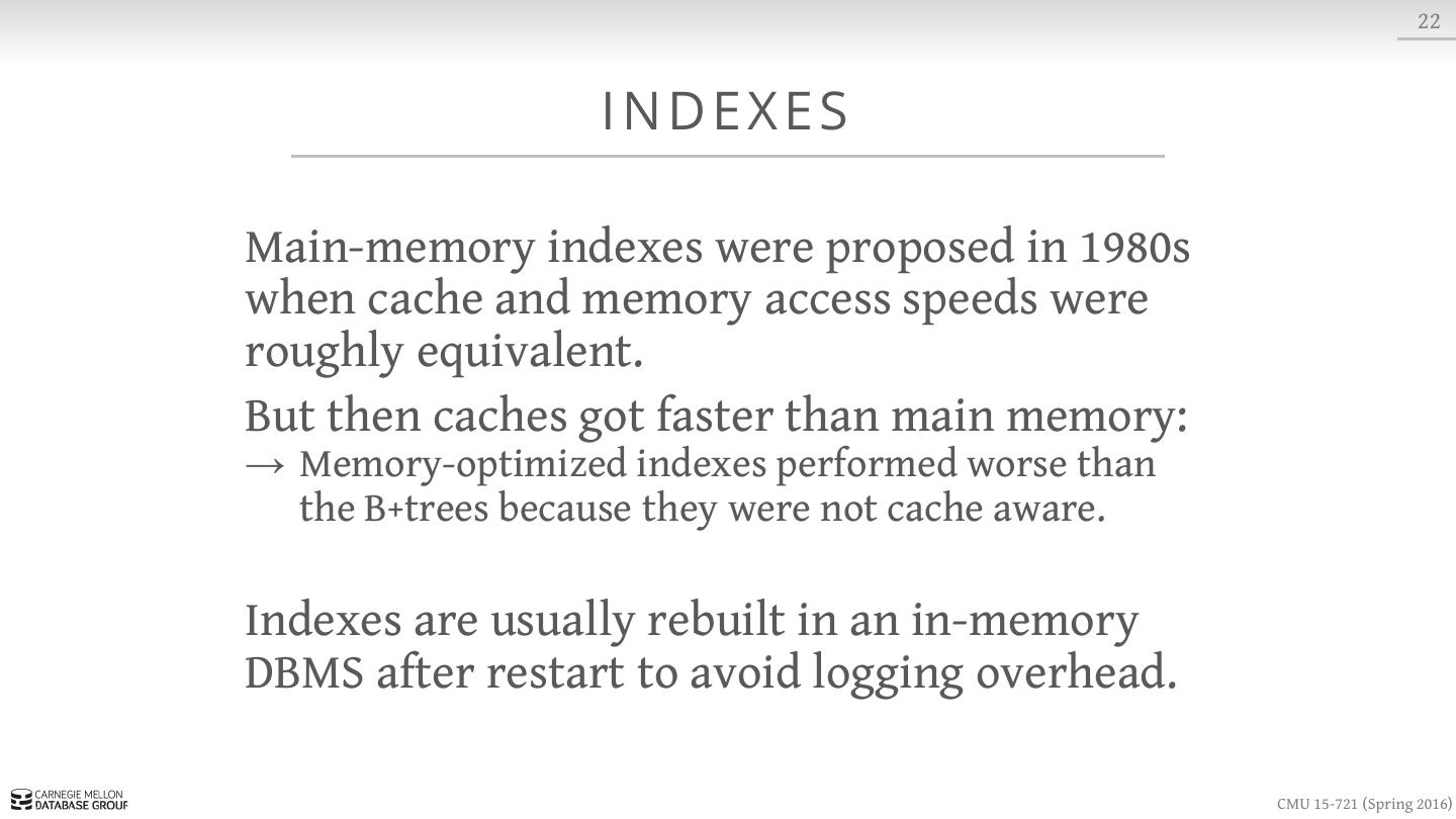21 . 8 S LOT T E D PAG E S Variable-length Data header blob1 blob2 blob3 · · · free space · · · tuple3 tuple2 tuple1 Fixed-length Data Slots CMU 15-721 (Spring 2016)