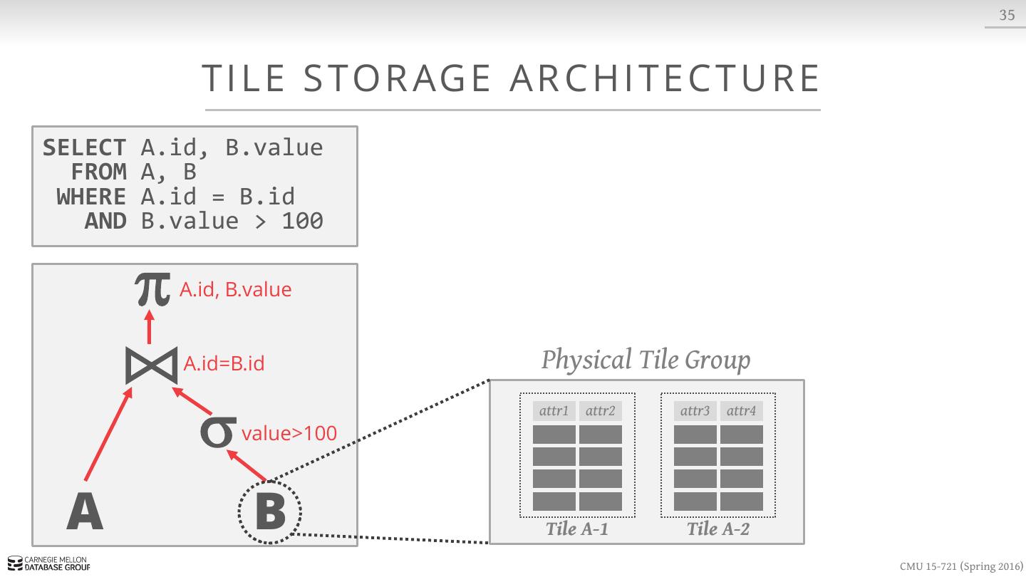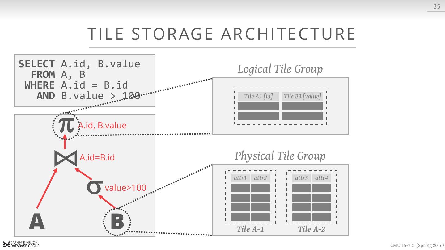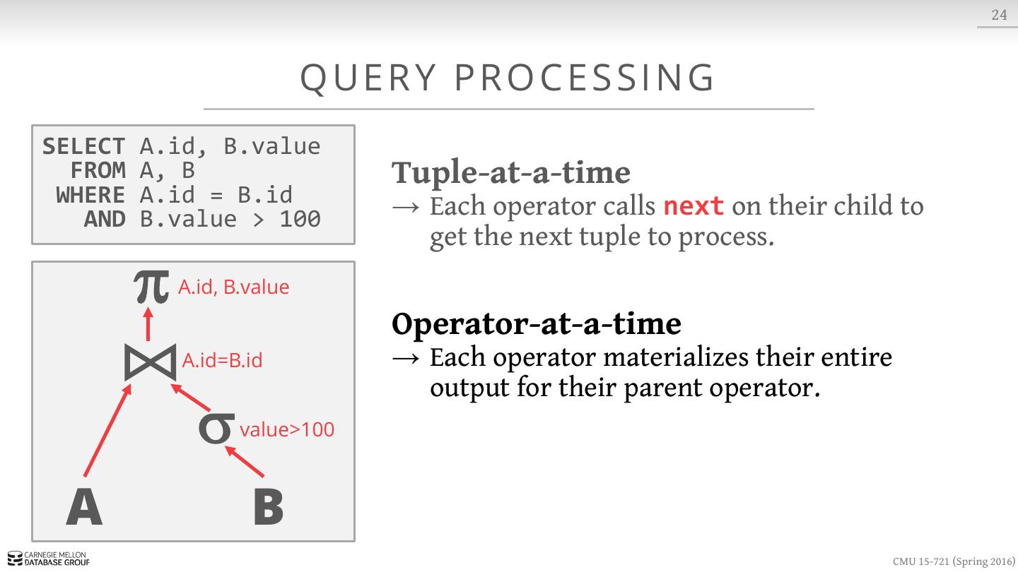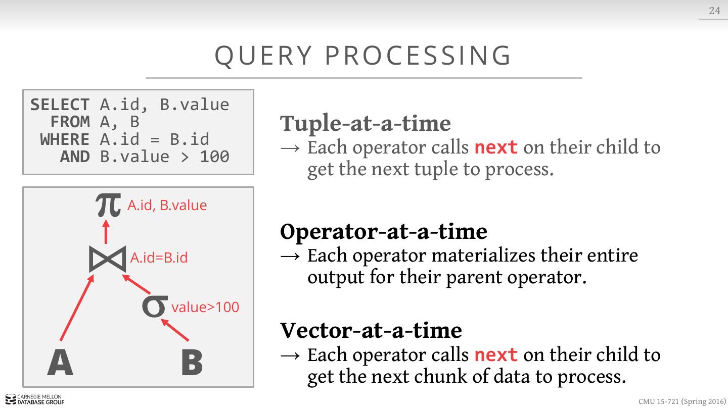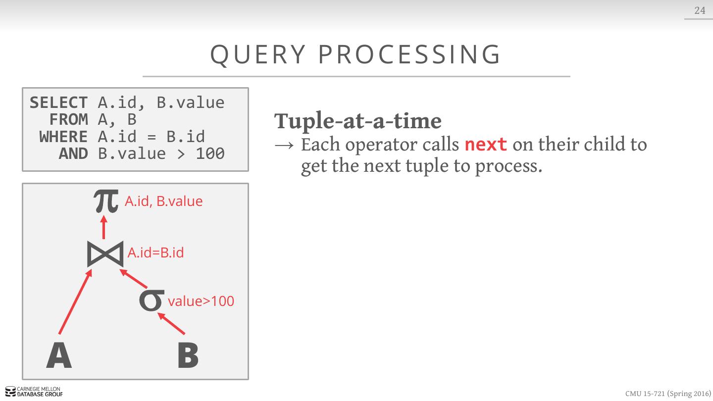 23 . 8 S LOT T E D PAG E S Variable-length Data header blob1 blob2 blob3 · · · free space · · · tuple3 tuple2 tuple1 Fixed-length Data Slots CMU 15-721 (Spring 2016)