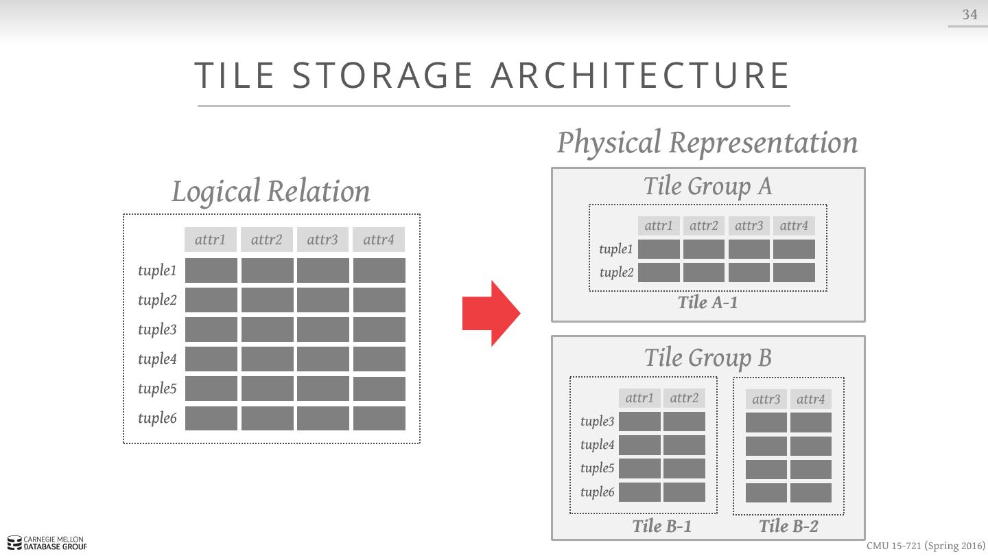 11 . 7 DATA O R G A N I Z AT I O N Index Buffer Pool Database (On-Disk) page6 page0 page2 page1 page4 page2 Page Id + Slot # Page Table Slotted Pages CMU 15-721 (Spring 2016)