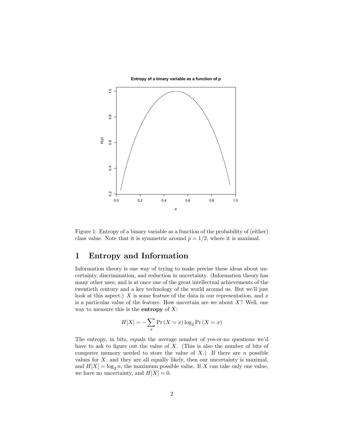 2 . Entropy of a binary variable as a function of p 1.0 0.8 H(p) 0.6 0.4 0.2 0.0 0.2 0.4 0.6 0.8 1.0 p Figure 1: Entropy of a binary variable as a function of the probability of (either) class value. Note that it is symmetric around p = 1/2, where it is maximal. 1 Entropy and Information Information theory is one way of trying to make precise these ideas about un- certainty, discrimination, and reduction in uncertainty. (Information theory has many other uses, and is at once one of the great intellectual achievements of the twentieth century and a key technology of the world around us. But we’ll just look at this aspect.) X is some feature of the data in our representation, and x is a particular value of the feature. How uncertain are we about X? Well, one way to measure this is the entropy of X: H[X] = − Pr (X = x) log2 Pr (X = x) x The entropy, in bits, equals the average number of yes-or-no questions we’d have to ask to figure out the value of X. (This is also the number of bits of computer memory needed to store the value of X.) If there are n possible values for X, and they are all equally likely, then our uncertainty is maximal, and H[X] = log2 n, the maximum possible value. If X can take only one value, we have no uncertainty, and H[X] = 0. 2