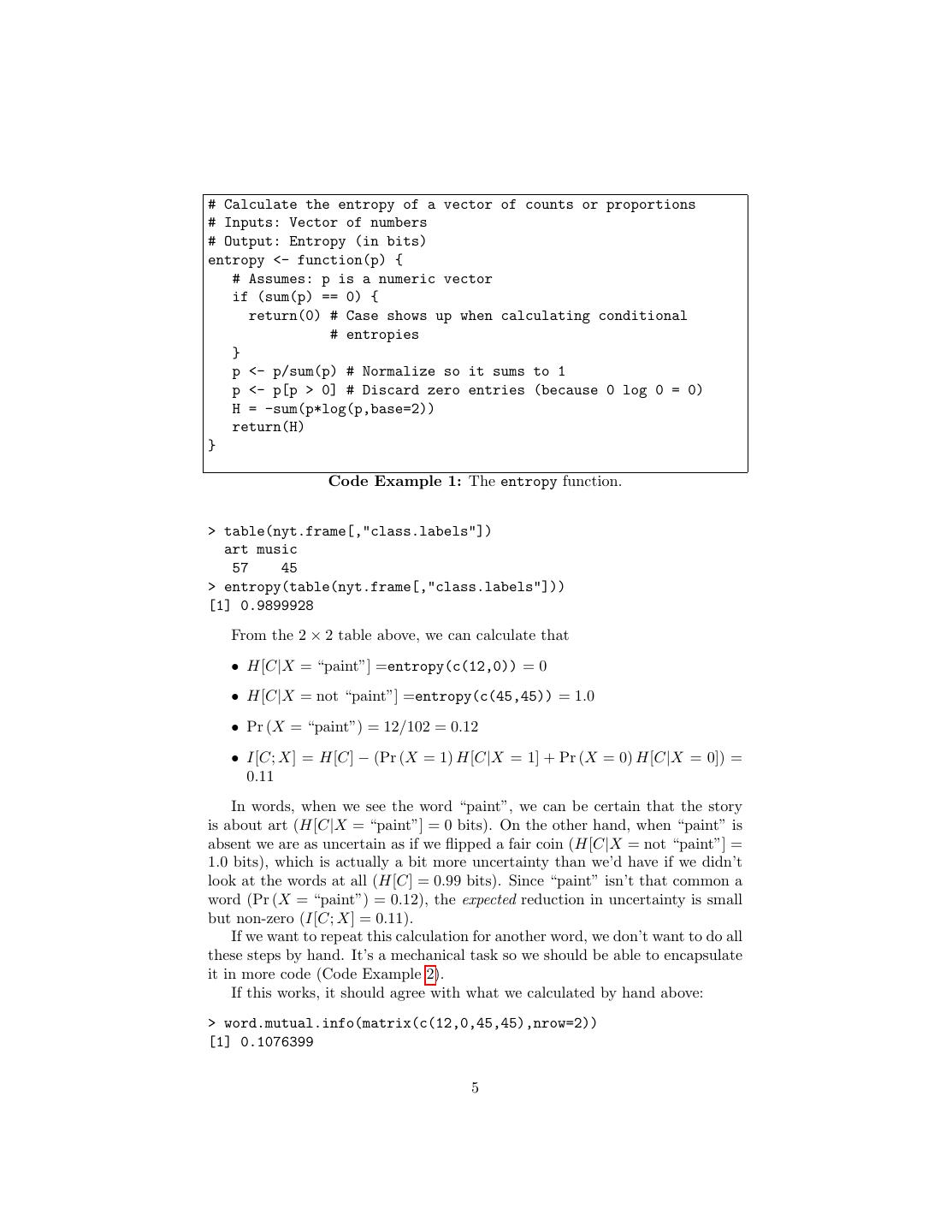 5 .# Calculate the entropy of a vector of counts or proportions # Inputs: Vector of numbers # Output: Entropy (in bits) entropy <- function(p) { # Assumes: p is a numeric vector if (sum(p) == 0) { return(0) # Case shows up when calculating conditional # entropies } p <- p/sum(p) # Normalize so it sums to 1 p <- p[p > 0] # Discard zero entries (because 0 log 0 = 0) H = -sum(p*log(p,base=2)) return(H) } Code Example 1: The entropy function. > table(nyt.frame[,"class.labels"]) art music 57 45 > entropy(table(nyt.frame[,"class.labels"])) [1] 0.9899928 From the 2 × 2 table above, we can calculate that • H[C|X = “paint”] =entropy(c(12,0)) = 0 • H[C|X = not “paint”] =entropy(c(45,45)) = 1.0 • Pr (X = “paint”) = 12/102 = 0.12 • I[C; X] = H[C] − (Pr (X = 1) H[C|X = 1] + Pr (X = 0) H[C|X = 0]) = 0.11 In words, when we see the word “paint”, we can be certain that the story is about art (H[C|X = “paint”] = 0 bits). On the other hand, when “paint” is absent we are as uncertain as if we flipped a fair coin (H[C|X = not “paint”] = 1.0 bits), which is actually a bit more uncertainty than we’d have if we didn’t look at the words at all (H[C] = 0.99 bits). Since “paint” isn’t that common a word (Pr (X = “paint”) = 0.12), the expected reduction in uncertainty is small but non-zero (I[C; X] = 0.11). If we want to repeat this calculation for another word, we don’t want to do all these steps by hand. It’s a mechanical task so we should be able to encapsulate it in more code (Code Example 2). If this works, it should agree with what we calculated by hand above: > word.mutual.info(matrix(c(12,0,45,45),nrow=2)) [1] 0.1076399 5