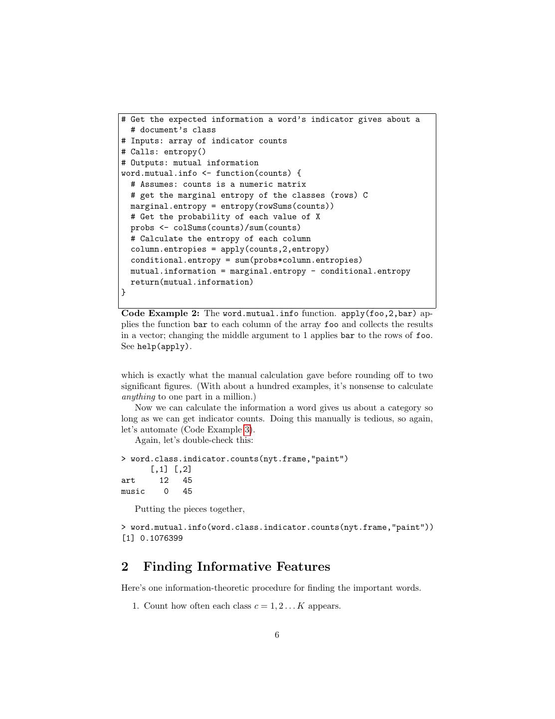 6 .# Get the expected information a word’s indicator gives about a # document’s class # Inputs: array of indicator counts # Calls: entropy() # Outputs: mutual information word.mutual.info <- function(counts) { # Assumes: counts is a numeric matrix # get the marginal entropy of the classes (rows) C marginal.entropy = entropy(rowSums(counts)) # Get the probability of each value of X probs <- colSums(counts)/sum(counts) # Calculate the entropy of each column column.entropies = apply(counts,2,entropy) conditional.entropy = sum(probs*column.entropies) mutual.information = marginal.entropy - conditional.entropy return(mutual.information) } Code Example 2: The word.mutual.info function. apply(foo,2,bar) ap- plies the function bar to each column of the array foo and collects the results in a vector; changing the middle argument to 1 applies bar to the rows of foo. See help(apply). which is exactly what the manual calculation gave before rounding off to two significant figures. (With about a hundred examples, it’s nonsense to calculate anything to one part in a million.) Now we can calculate the information a word gives us about a category so long as we can get indicator counts. Doing this manually is tedious, so again, let’s automate (Code Example 3). Again, let’s double-check this: > word.class.indicator.counts(nyt.frame,"paint") [,1] [,2] art 12 45 music 0 45 Putting the pieces together, > word.mutual.info(word.class.indicator.counts(nyt.frame,"paint")) [1] 0.1076399 2 Finding Informative Features Here’s one information-theoretic procedure for finding the important words. 1. Count how often each class c = 1, 2 . . . K appears. 6