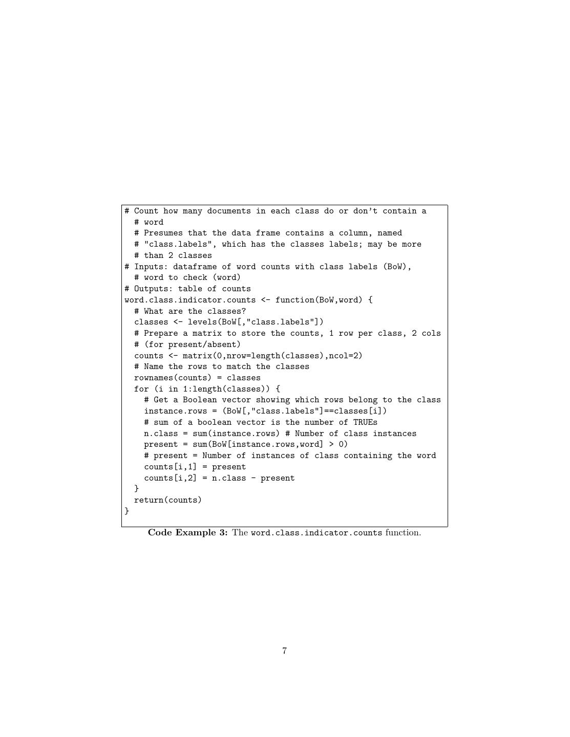 7 .# Count how many documents in each class do or don’t contain a # word # Presumes that the data frame contains a column, named # "class.labels", which has the classes labels; may be more # than 2 classes # Inputs: dataframe of word counts with class labels (BoW), # word to check (word) # Outputs: table of counts word.class.indicator.counts <- function(BoW,word) { # What are the classes? classes <- levels(BoW[,"class.labels"]) # Prepare a matrix to store the counts, 1 row per class, 2 cols # (for present/absent) counts <- matrix(0,nrow=length(classes),ncol=2) # Name the rows to match the classes rownames(counts) = classes for (i in 1:length(classes)) { # Get a Boolean vector showing which rows belong to the class instance.rows = (BoW[,"class.labels"]==classes[i]) # sum of a boolean vector is the number of TRUEs n.class = sum(instance.rows) # Number of class instances present = sum(BoW[instance.rows,word] > 0) # present = Number of instances of class containing the word counts[i,1] = present counts[i,2] = n.class - present } return(counts) } Code Example 3: The word.class.indicator.counts function. 7