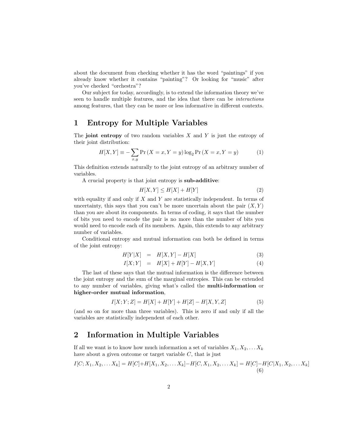 2 .about the document from checking whether it has the word “paintings” if you already know whether it contains “painting”? Or looking for “music” after you’ve checked “orchestra”? Our subject for today, accordingly, is to extend the information theory we’ve seen to handle multiple features, and the idea that there can be interactions among features, that they can be more or less informative in different contexts. 1 Entropy for Multiple Variables The joint entropy of two random variables X and Y is just the entropy of their joint distribution: H[X, Y ] ≡ − Pr (X = x, Y = y) log2 Pr (X = x, Y = y) (1) x,y This definition extends naturally to the joint entropy of an arbitrary number of variables. A crucial property is that joint entropy is sub-additive: H[X, Y ] ≤ H[X] + H[Y ] (2) with equality if and only if X and Y are statistically independent. In terms of uncertainty, this says that you can’t be more uncertain about the pair (X, Y ) than you are about its components. In terms of coding, it says that the number of bits you need to encode the pair is no more than the number of bits you would need to encode each of its members. Again, this extends to any arbitrary number of variables. Conditional entropy and mutual information can both be defined in terms of the joint entropy: H[Y |X] = H[X, Y ] − H[X] (3) I[X; Y ] = H[X] + H[Y ] − H[X, Y ] (4) The last of these says that the mutual information is the difference between the joint entropy and the sum of the marginal entropies. This can be extended to any number of variables, giving what’s called the multi-information or higher-order mutual information, I[X; Y ; Z] = H[X] + H[Y ] + H[Z] − H[X, Y, Z] (5) (and so on for more than three variables). This is zero if and only if all the variables are statistically independent of each other. 2 Information in Multiple Variables If all we want is to know how much information a set of variables X1 , X2 , . . . Xk have about a given outcome or target variable C, that is just I[C; X1 , X2 , . . . Xk ] = H[C]+H[X1 , X2 , . . . Xk ]−H[C, X1 , X2 , . . . Xk ] = H[C]−H[C|X1 , X2 , . . . Xk ] (6) 2