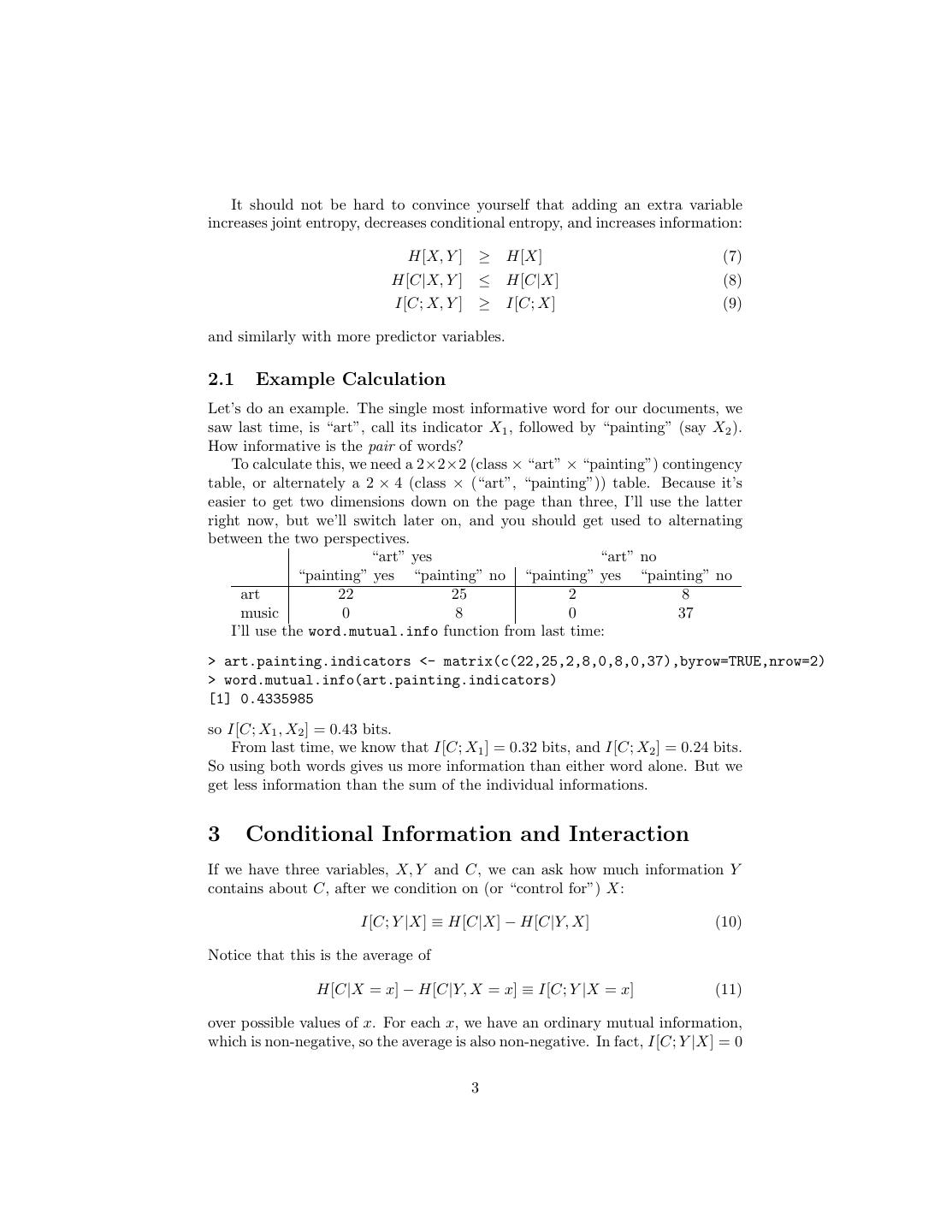 3 . It should not be hard to convince yourself that adding an extra variable increases joint entropy, decreases conditional entropy, and increases information: H[X, Y ] ≥ H[X] (7) H[C|X, Y ] ≤ H[C|X] (8) I[C; X, Y ] ≥ I[C; X] (9) and similarly with more predictor variables. 2.1 Example Calculation Let’s do an example. The single most informative word for our documents, we saw last time, is “art”, call its indicator X1 , followed by “painting” (say X2 ). How informative is the pair of words? To calculate this, we need a 2×2×2 (class × “art” × “painting”) contingency table, or alternately a 2 × 4 (class × (“art”, “painting”)) table. Because it’s easier to get two dimensions down on the page than three, I’ll use the latter right now, but we’ll switch later on, and you should get used to alternating between the two perspectives. “art” yes “art” no “painting” yes “painting” no “painting” yes “painting” no art 22 25 2 8 music 0 8 0 37 I’ll use the word.mutual.info function from last time: > art.painting.indicators <- matrix(c(22,25,2,8,0,8,0,37),byrow=TRUE,nrow=2) > word.mutual.info(art.painting.indicators) [1] 0.4335985 so I[C; X1 , X2 ] = 0.43 bits. From last time, we know that I[C; X1 ] = 0.32 bits, and I[C; X2 ] = 0.24 bits. So using both words gives us more information than either word alone. But we get less information than the sum of the individual informations. 3 Conditional Information and Interaction If we have three variables, X, Y and C, we can ask how much information Y contains about C, after we condition on (or “control for”) X: I[C; Y |X] ≡ H[C|X] − H[C|Y, X] (10) Notice that this is the average of H[C|X = x] − H[C|Y, X = x] ≡ I[C; Y |X = x] (11) over possible values of x. For each x, we have an ordinary mutual information, which is non-negative, so the average is also non-negative. In fact, I[C; Y |X] = 0 3